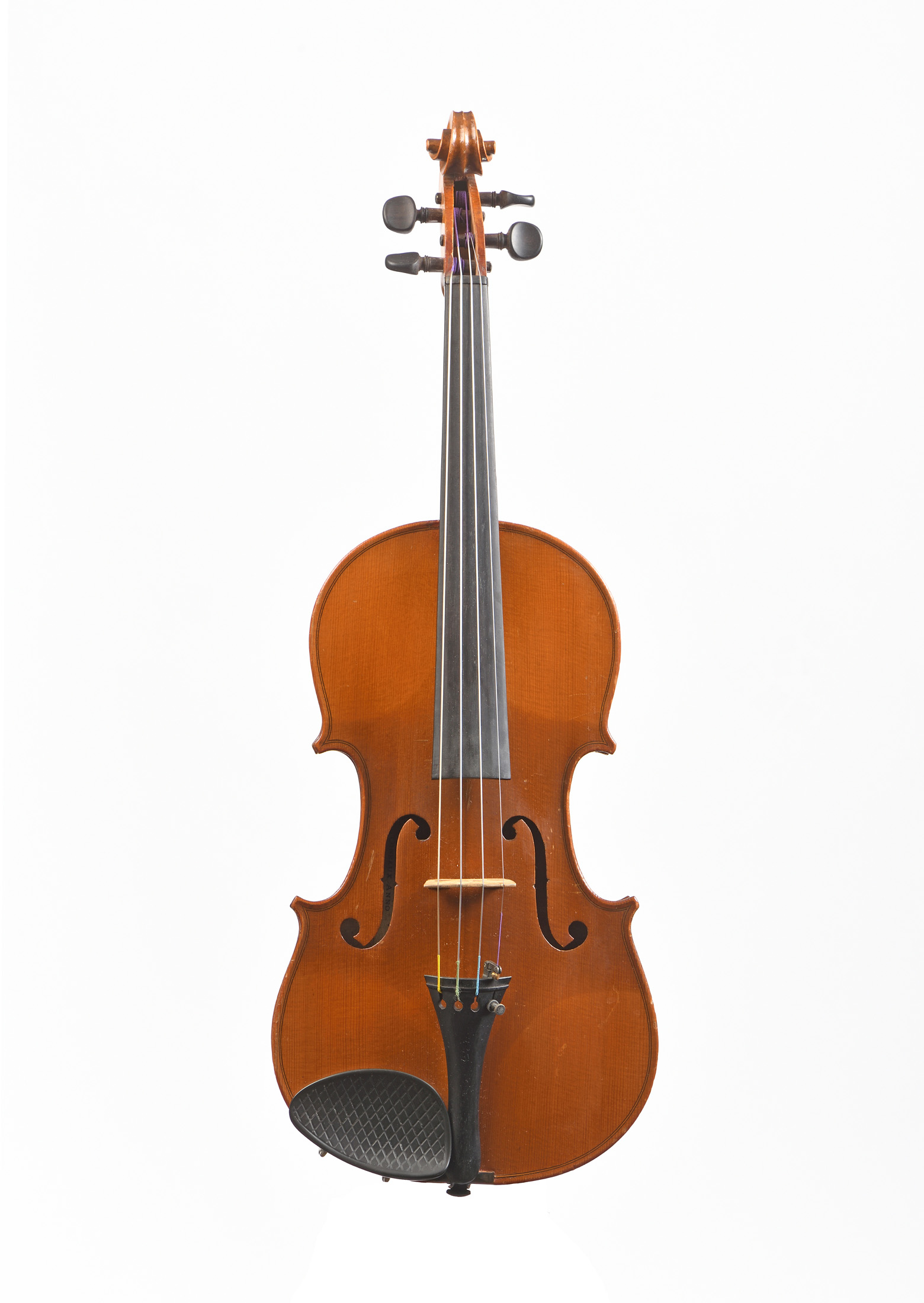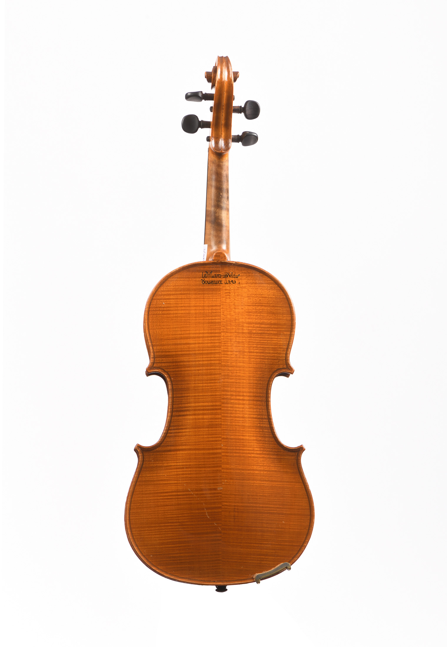 portant une étiquette "Le marquis de l'air d'oiseaux..." et une marque sous le talon du manche. Fond de deux pièces en érable aux petites ondes serrées. Vernis brun sur fond doré. 359 mm. Avec boite et archet.