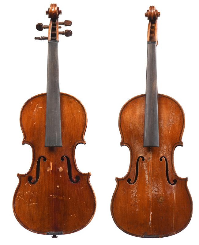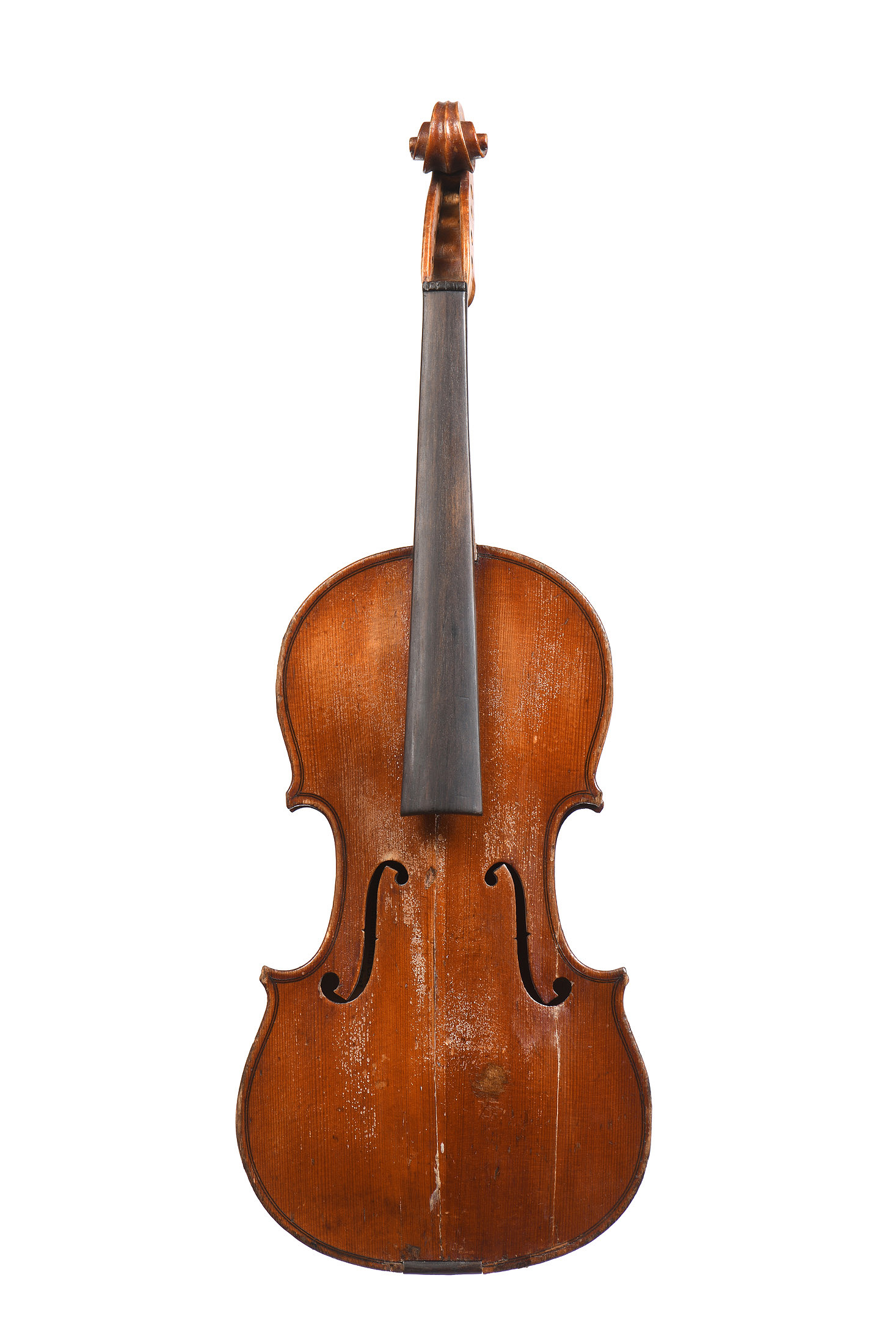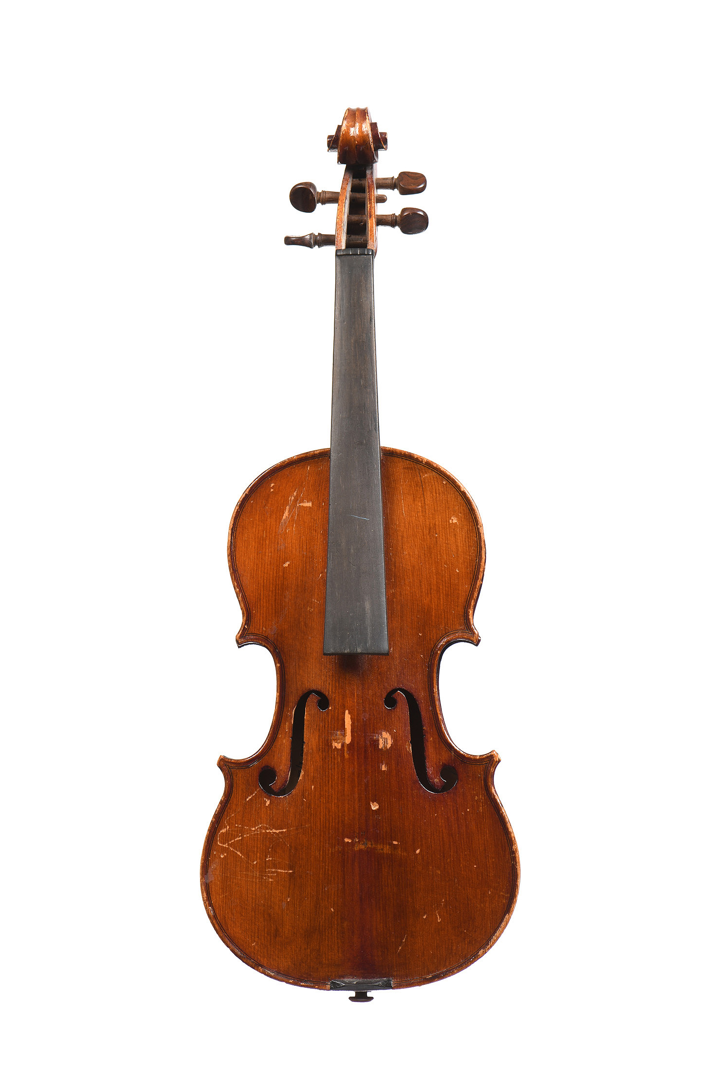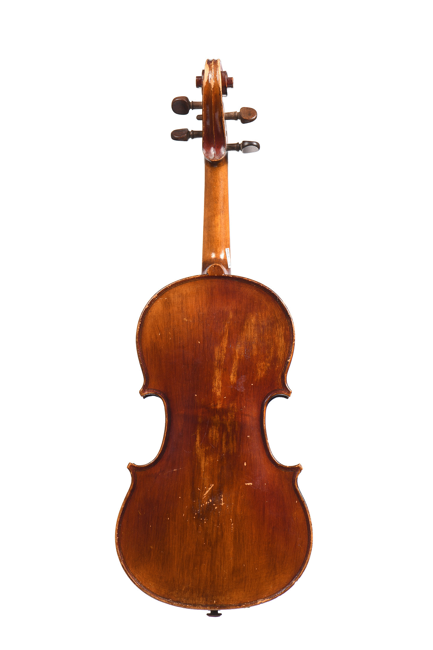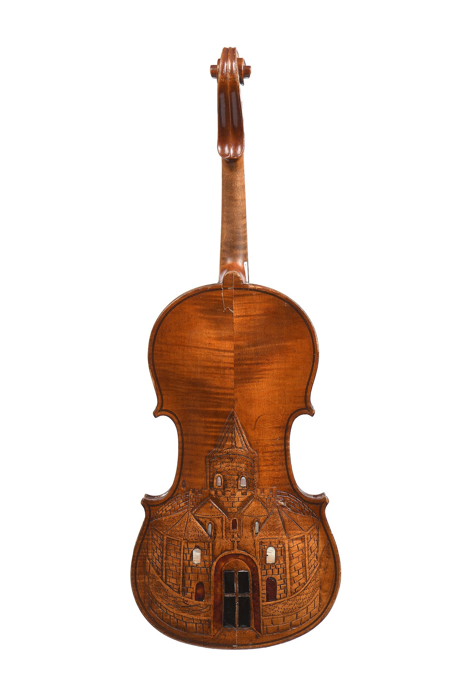 - un violon demi, fond décoré représentant une église fortifiée. 340mm.