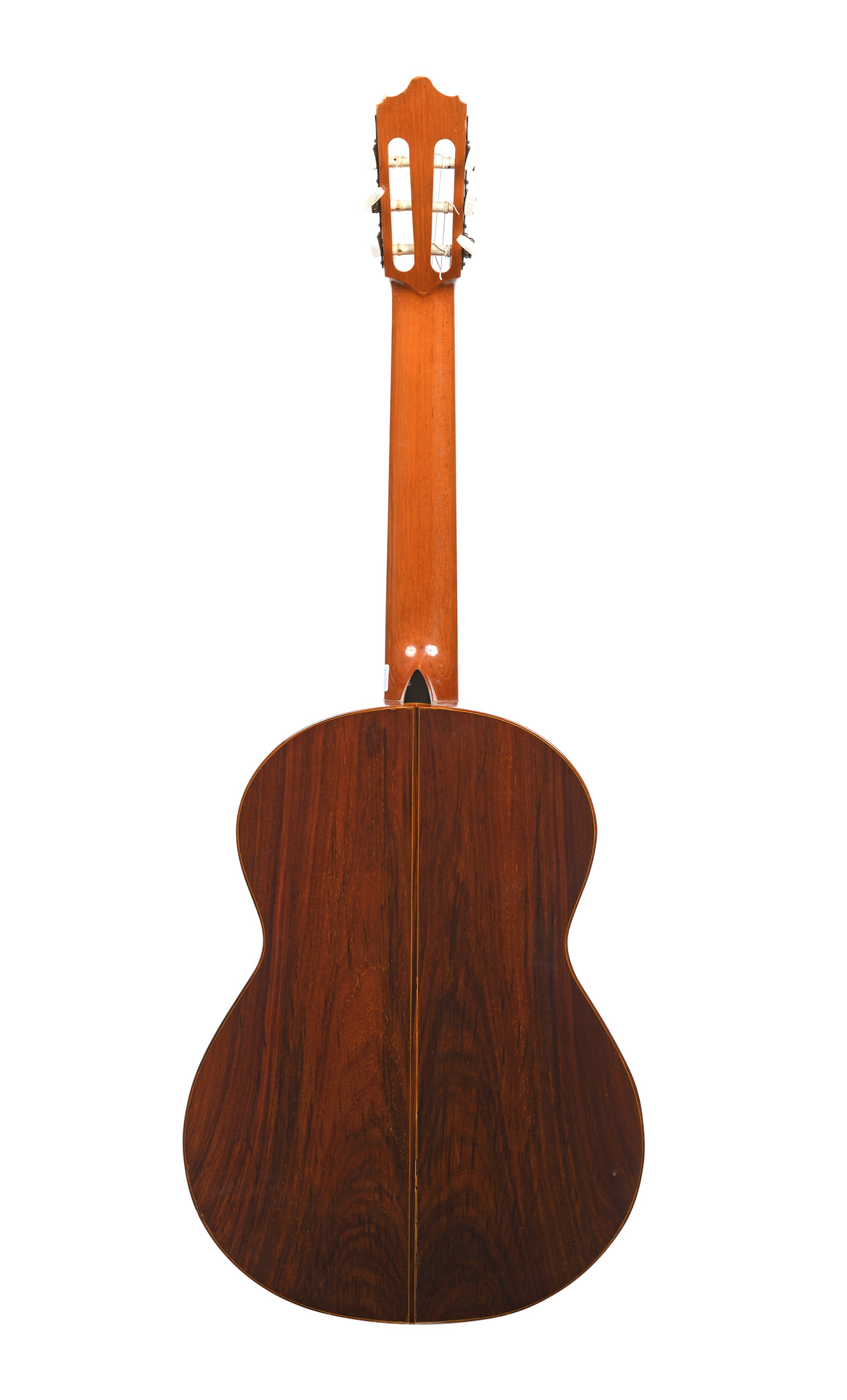 Guitare d'étude portant l'étiquette "Dominique Delarue Luthier. 1987. Mod C2. 1938. Fond de deux pièces en palissandre. Chocs aux éclisses. Cassures à la table. Joint du fond à revoir.