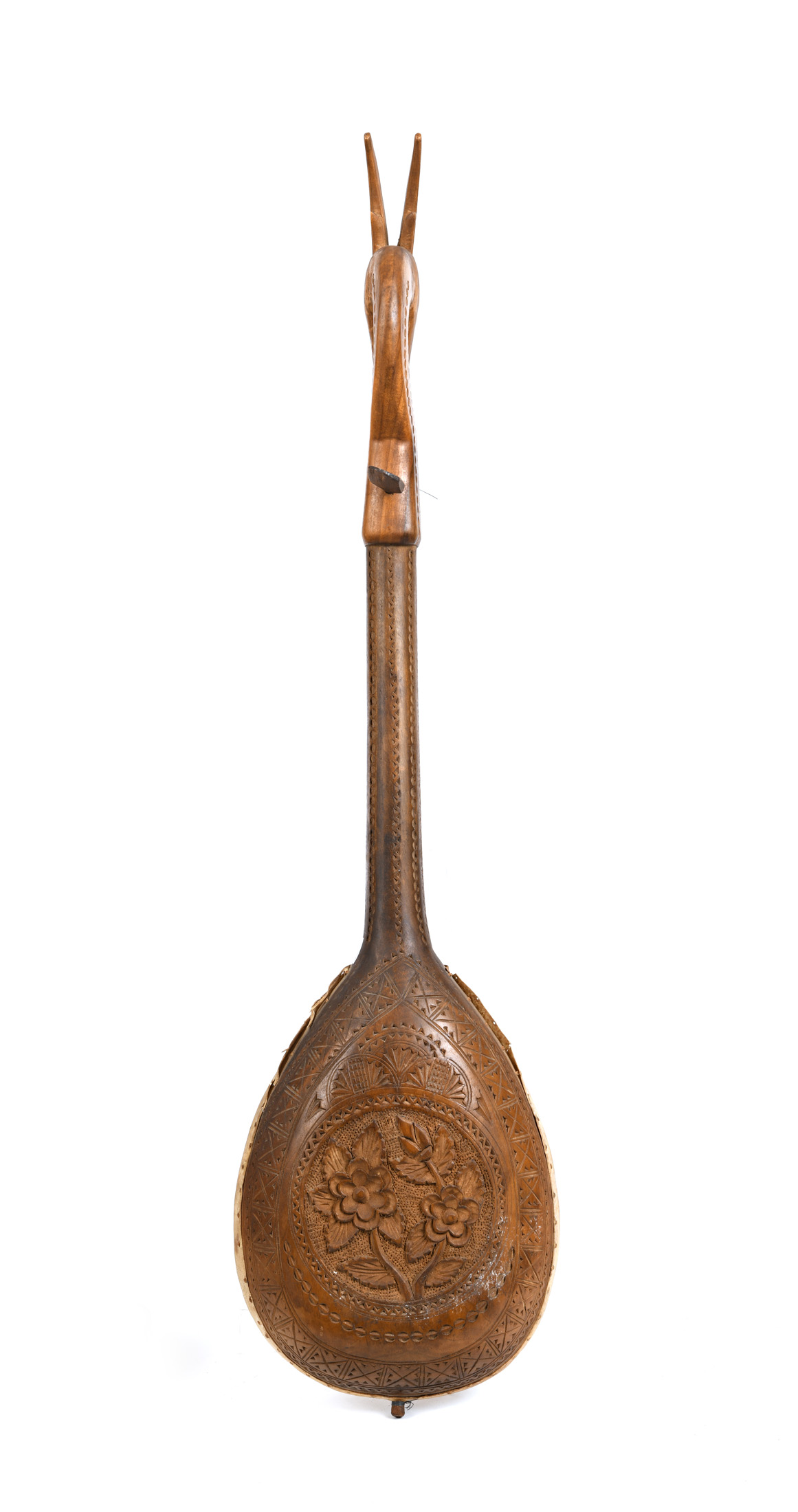 Luth probablement Indien ou Népalais. Manche sculpté d'éléments géométriques. Tête sculptée d'un bouc. Fond sculpté de frises géométriques entourant une plante en floraison. L'ensemble est à restaurer. 85 cm.