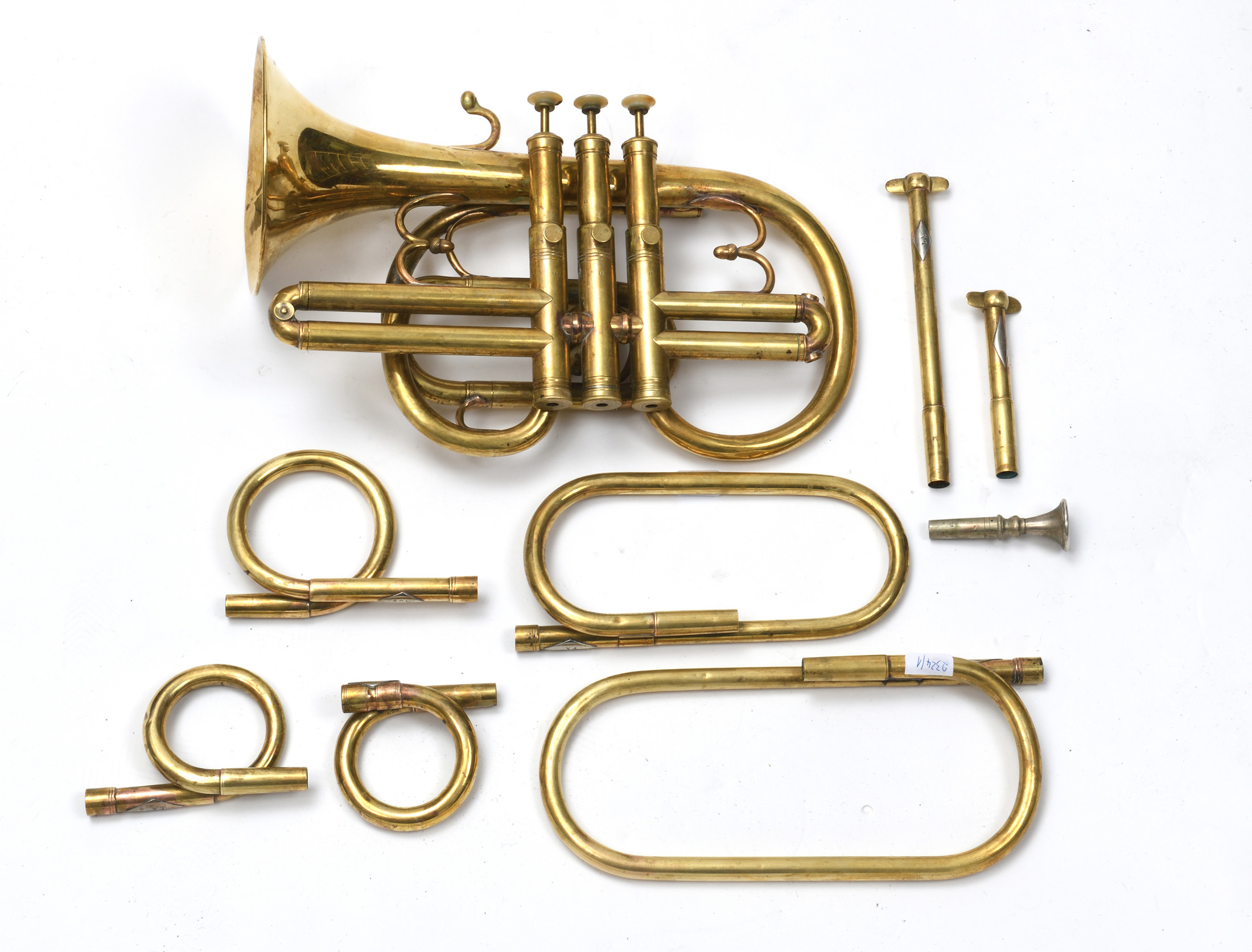 Cornet à trois pistons. Avec divers éléments de tonalité. Bossué et rayé: l'ensemble est à revoir.
