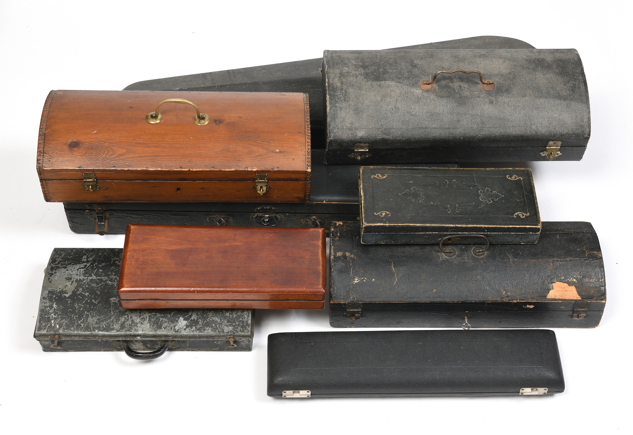 Important lot de boites anciennes, étuis, d'instruments à vent. Clarinettes, flutes... En l'état.