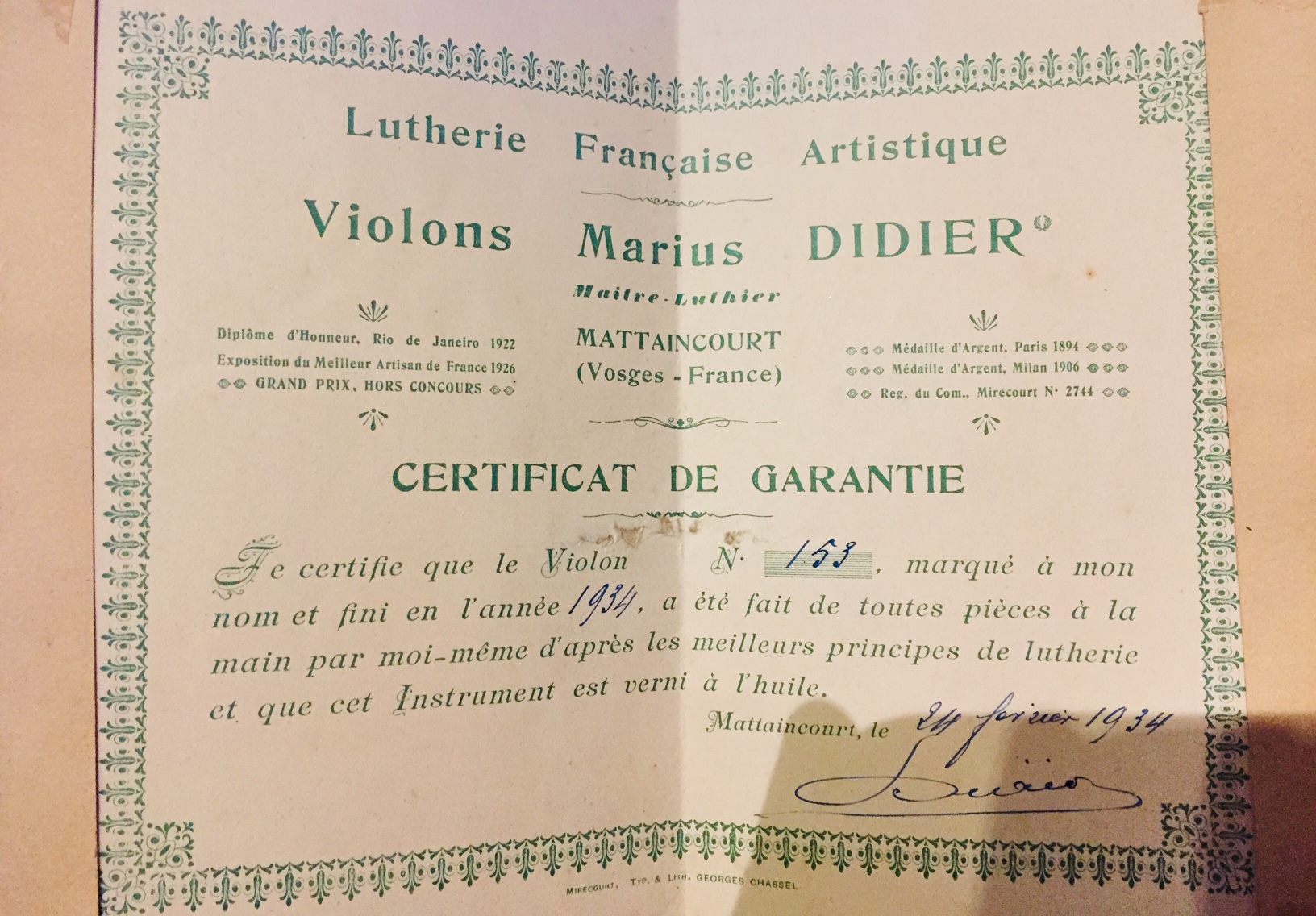 French violin by Marius DIDIER bearing the label and stamps. With its original certificate.