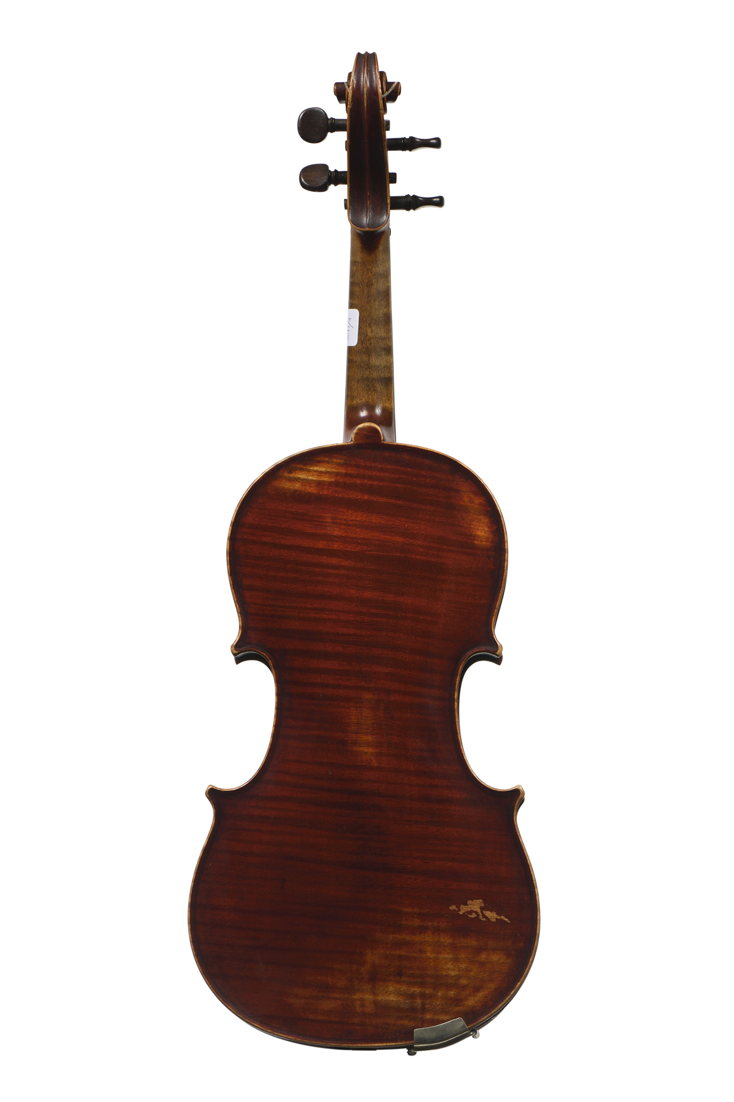 portant une étiquette "Joseph GUARINI Anno 1877. N°492. Emile Mennesson, à Reims (Marne. Seul concessionnaire pour la France et l'Etranger. Deposé". Fond d'une pièce en bel érable. Table en épicéa. Vernis brun rouge. 354 mm.