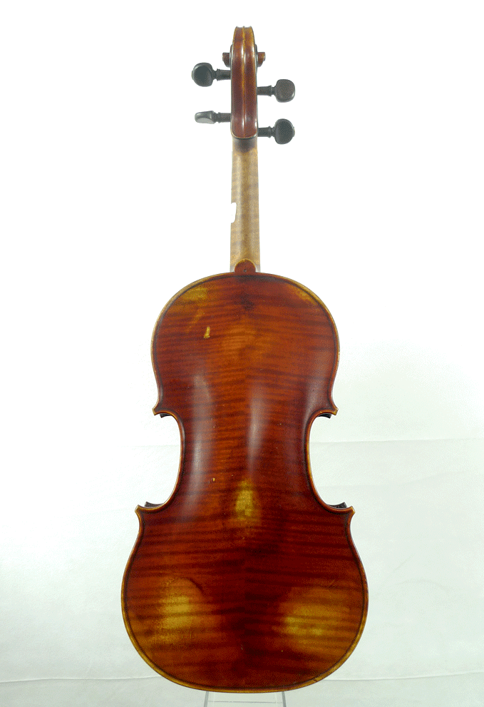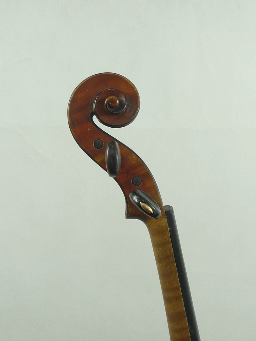 portant une étiquette de Pierre HEL Luthier - 1907 et une marque au fer au dessus du bouton. Fond de deux pièces en érable aux ondes régulières et horizontales. Table en épicéa. Vernis rouge brun sur fond doré.