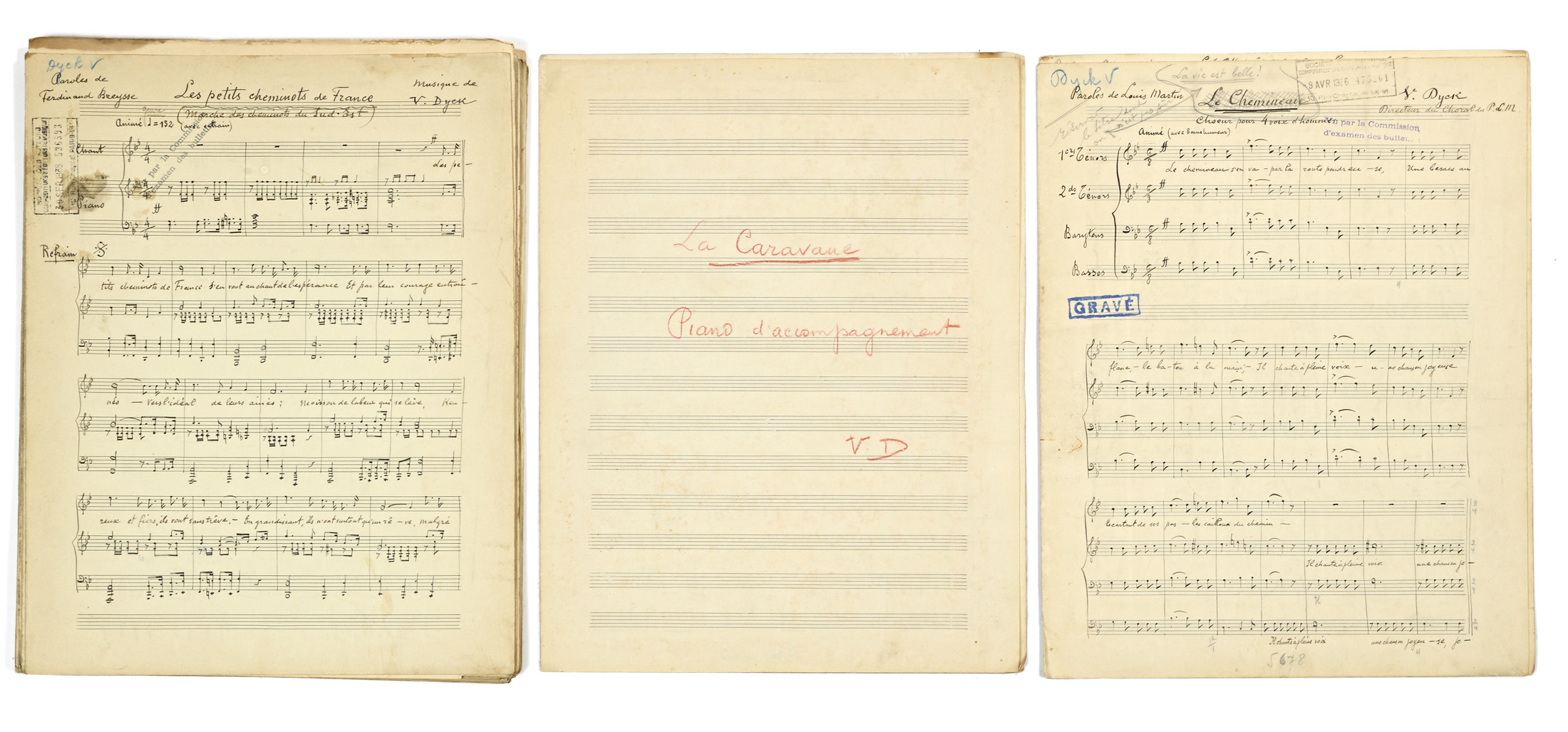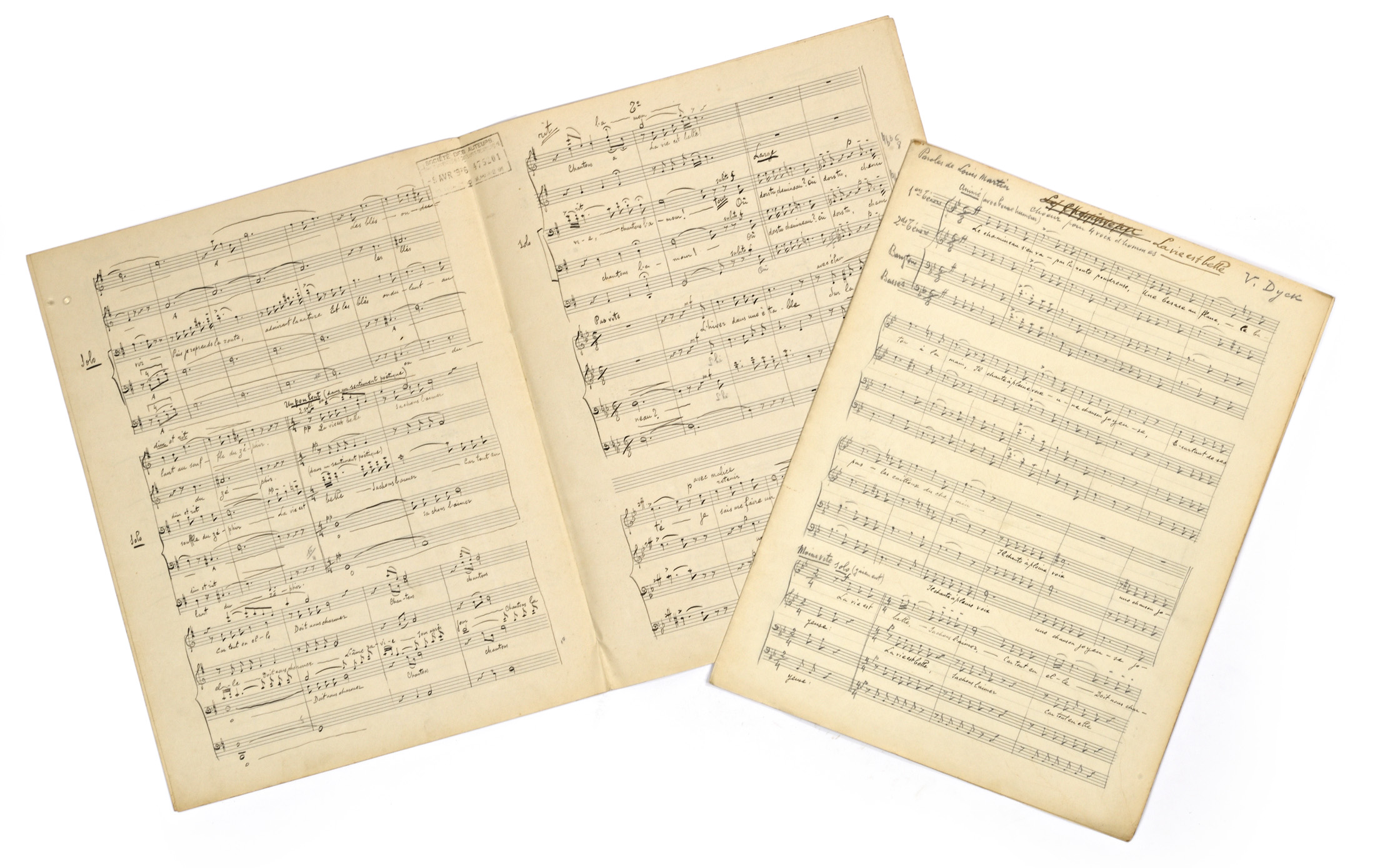 - "Le Chemineau" barré pour "La vie est belle!". Note de l'auteur " Réserver le titre dont on n'est pas sûr". Signé V.Dyck . Directeur de du Choral du P.L.M. Paroles de Louis Martin. Cachet de la société des auteurs et compositeurs & éditeurs de musique. 9 Avril 1926 - 475261. Cachet GRAVE. Daté et signé à la fin "V.Dyck Paris le 6 avril 1936"