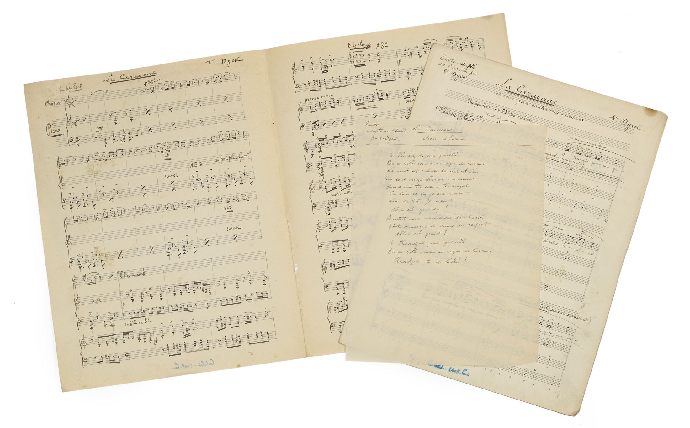 - La Caravane. Piano d'accompagnement. Signé V.D au crayon. Texte adapté de l'arabe par V.DYCK. Cachet Costallat -2108 PARIS. Papier à 16 lignes. 10 Pages à l'encre.