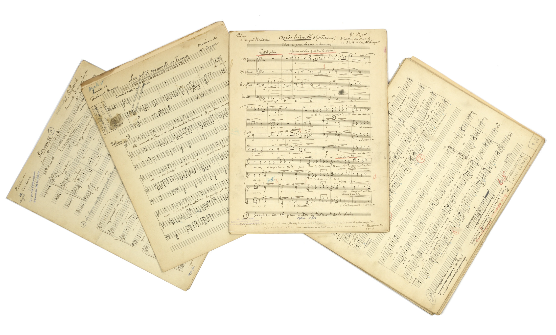 - Après l'Angelus (Nocturne). Poésie d'Angel Ferdeau. Coeur pour 4 voix d'hommes. Signé V.DYCK Directeur chorales du P.L.M et des Allobroges. Cachet: G.LEBLANC Editions musicales "L'orphéon". Papier à 14 lignes. 8 pages à l'encre.