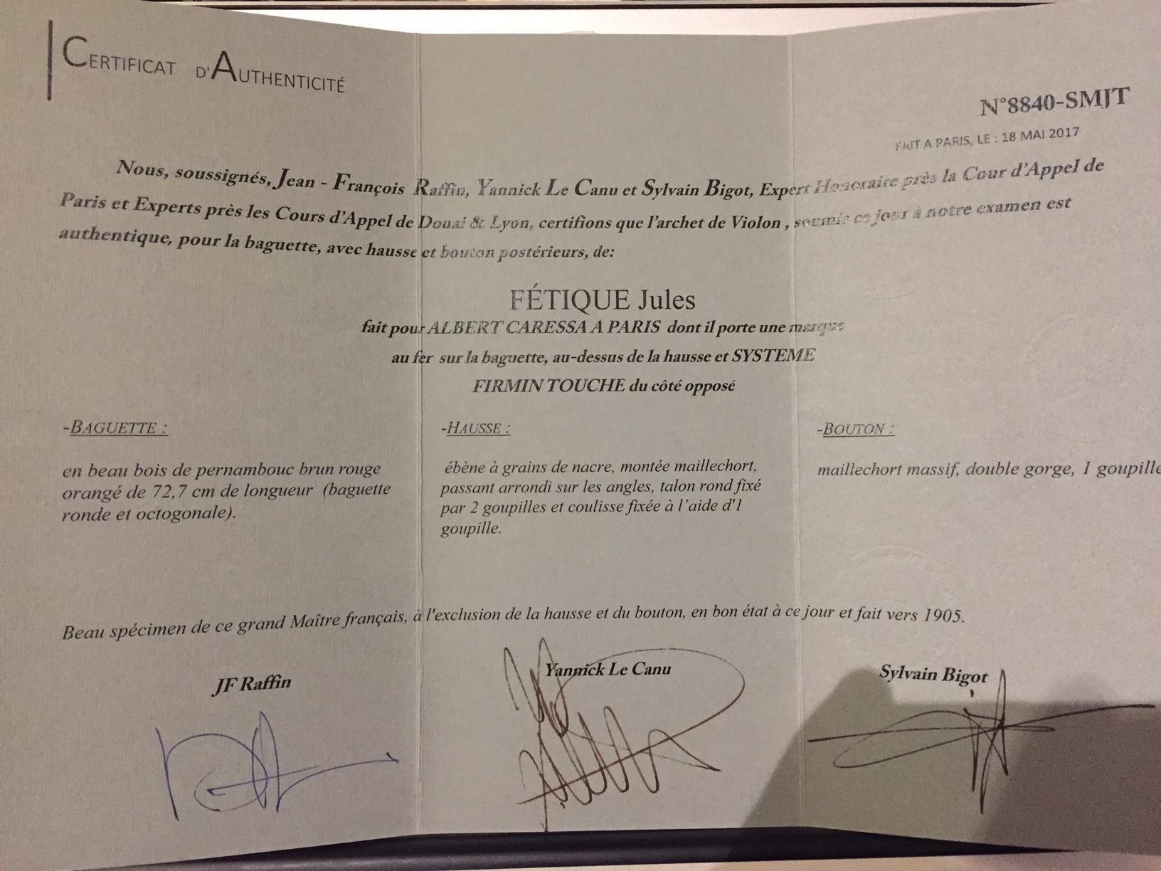fait vers 1905 par Jules FETIQUE pour Albert CARESSA à Paris dont il porte une marque au fer "CARESSA A PARIS" et une seconde marque : "Systeme Firmin touche" sur le coté opposé. Baguette octogonale en bois de pernambouc. hausse ébène à talon rond, monté maillchort. Hausse et bouton postérieur.