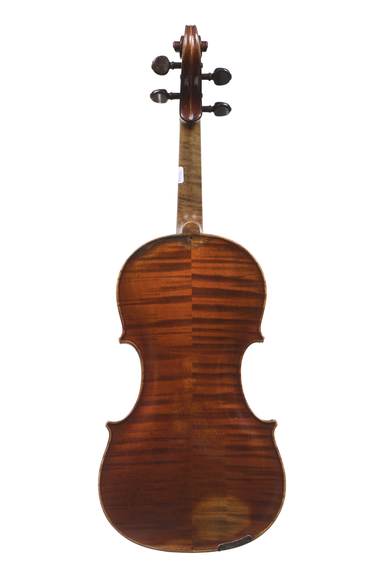 dont il porte l'étiquette originale "Paul BLANCHARD à Lyon, 1894. N°345." et la marque au fer "P BLANCHARD A LYON" sur le tasseau du manche. Fond de deux pièces en bel érable aux ondes larges et horizontales. Table en épicéa aux pores réguliers. Vernis orangé rouge sur fond doré. 354 mm.