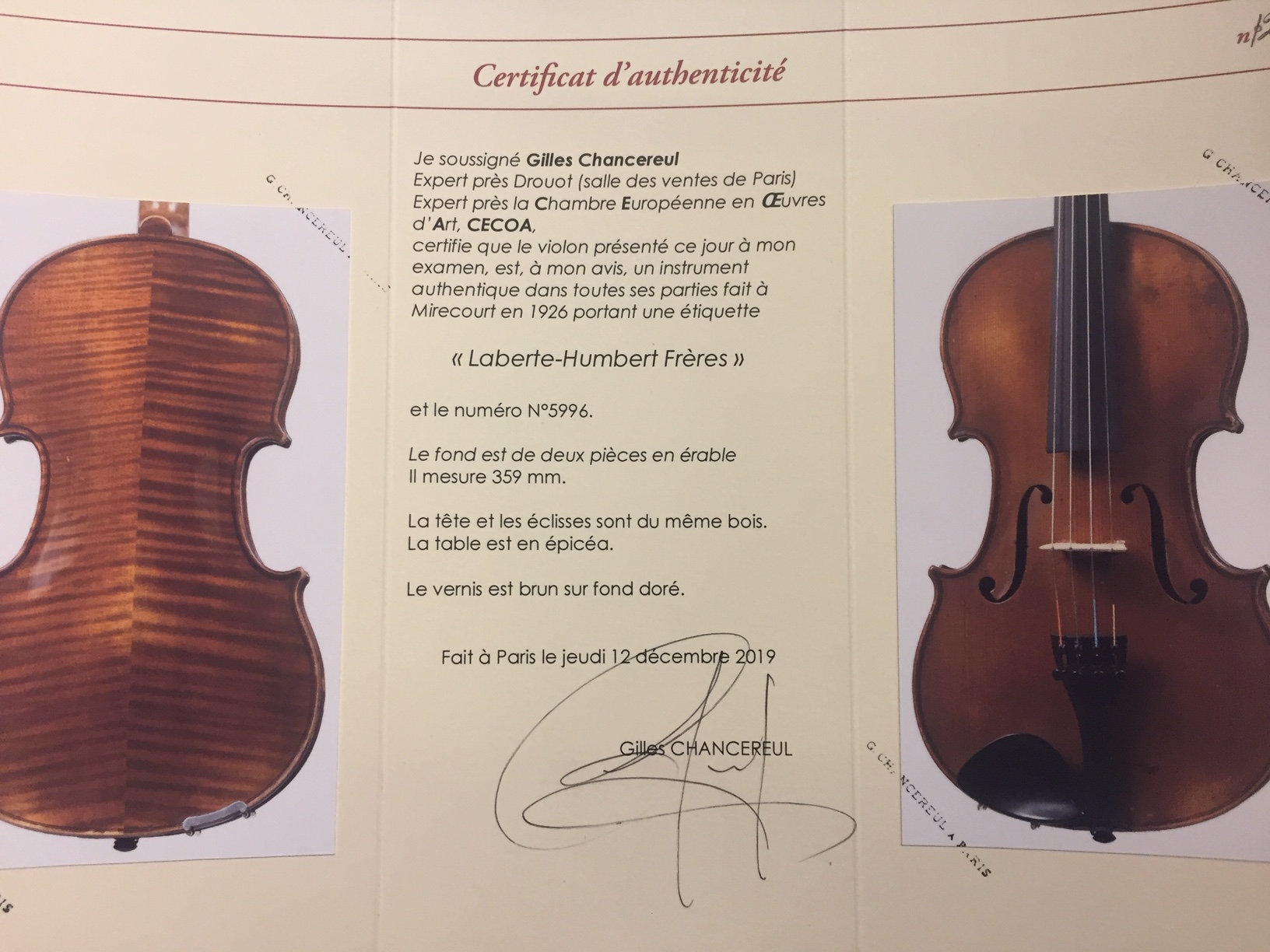 portant l'étiquette "Laberte-Humbert Frères, N°5996.1926 Mirecourt". Fond de deux pièces. Vernis brun sur fond doré. 359 mm.