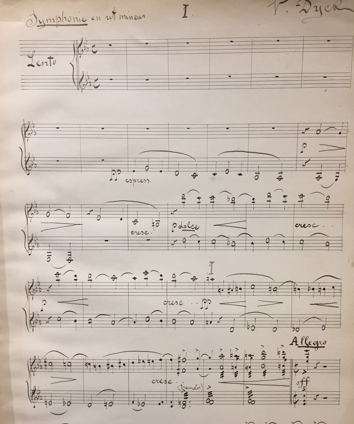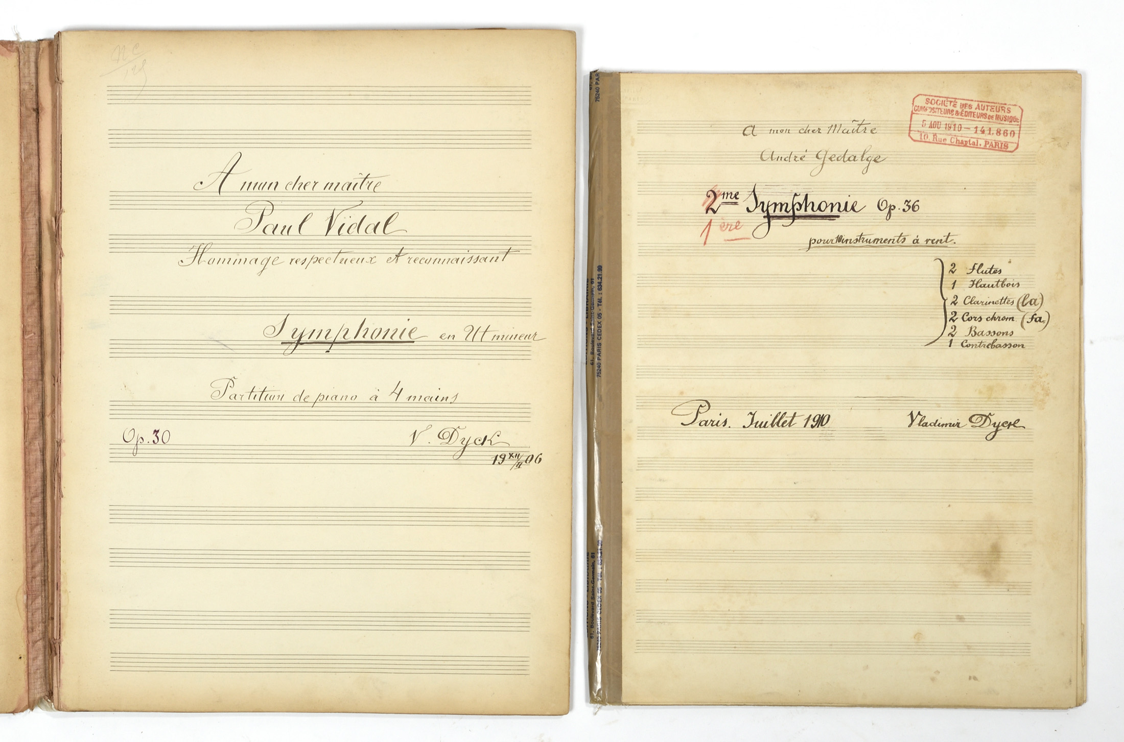 - Symphonie en Ut mineur. Partition de piano à 4 mains. Op 30. Signé V Dyck 19 XII/II06. "A mon cher maitre Paul Vidal. Hommage respectueux et reconnaissant. Papier à 12 lignes à l'encre. 58 pages. Reliure abimée.