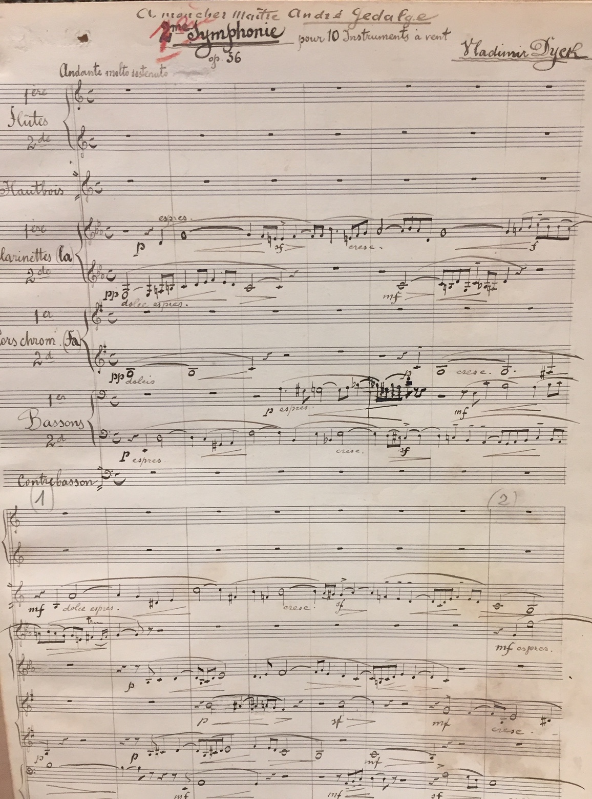 2me Symphonie (Barré au crayon : 1ère) Op.36. Pour 10 instruments à vent. "A mon cher maitre André Gedalge" (1856 – 1926) Compositeur et pédagogue français. Paris Juillet 1910. Pour 10 instruments à vent: 2 flûtes, 1 hautbois, 2 Clarinettes (La), 2 Cors chrom (fa), 2 Bassons, 1 contrebasson. Papier à 20 lignes à l'encre. Portant le cachet des auteurs et compositeurs & editeurs de musique. 5 Aout 1910 - 141860. 57 pages. Importantes traces d'humidité.