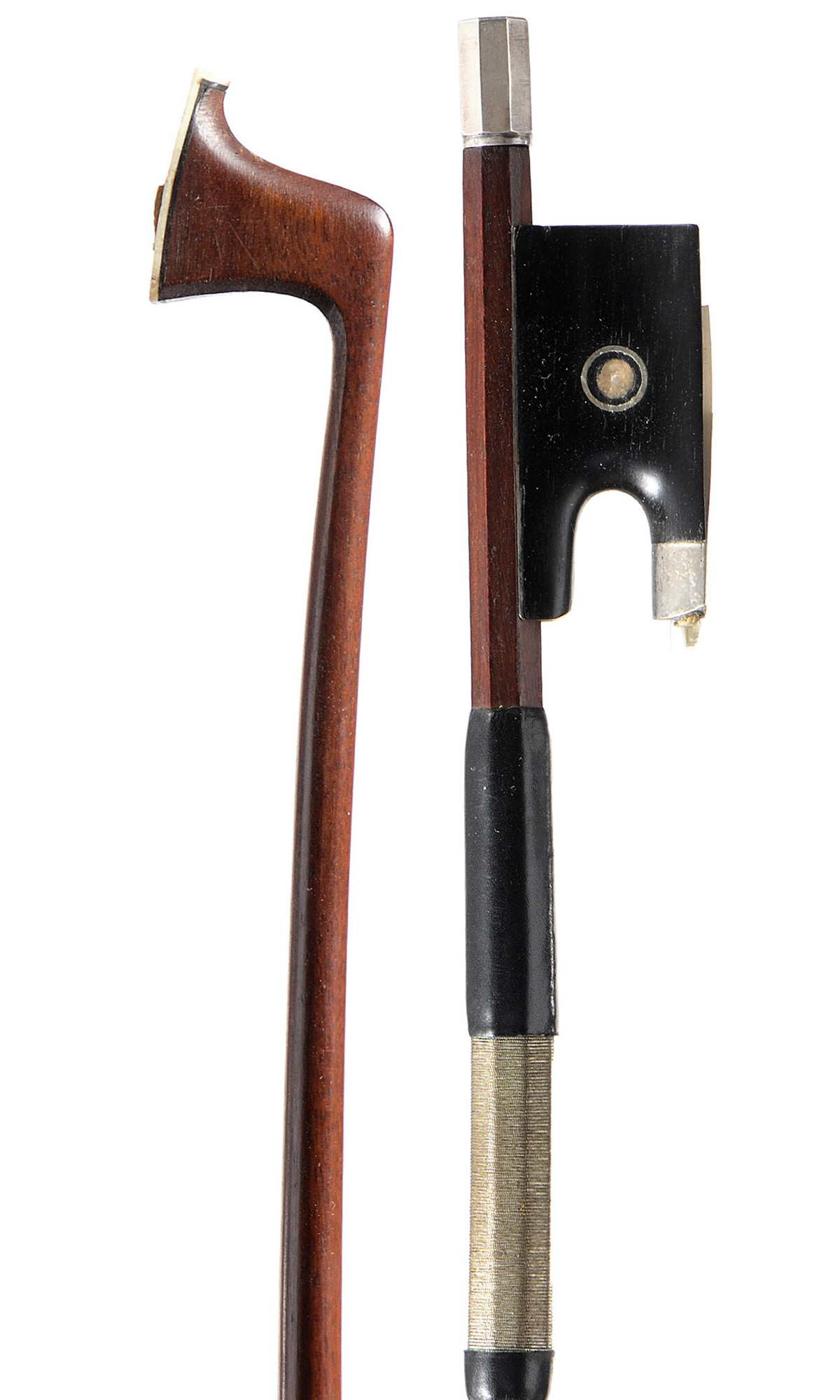 Baguette ronde en beau bois de pernambouc. Hausse ébène, monté argent. 728 mm. 51 g sans mèche, avec garniture argent sur soie.
