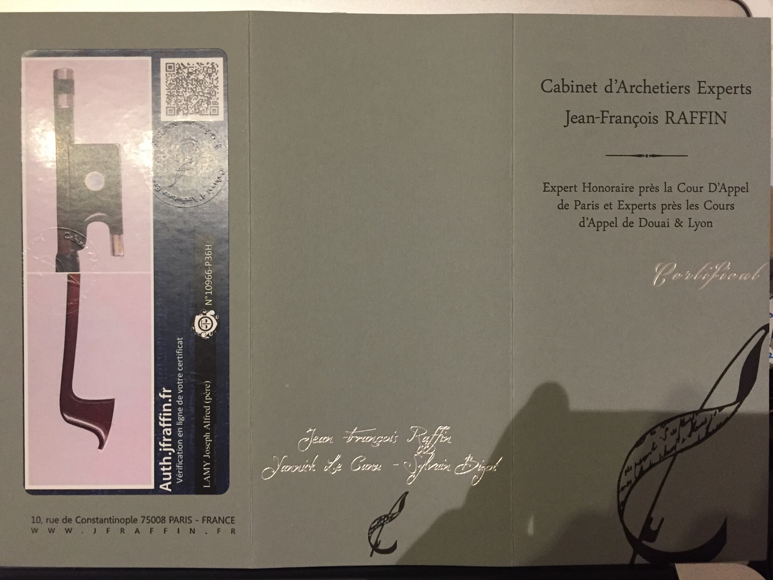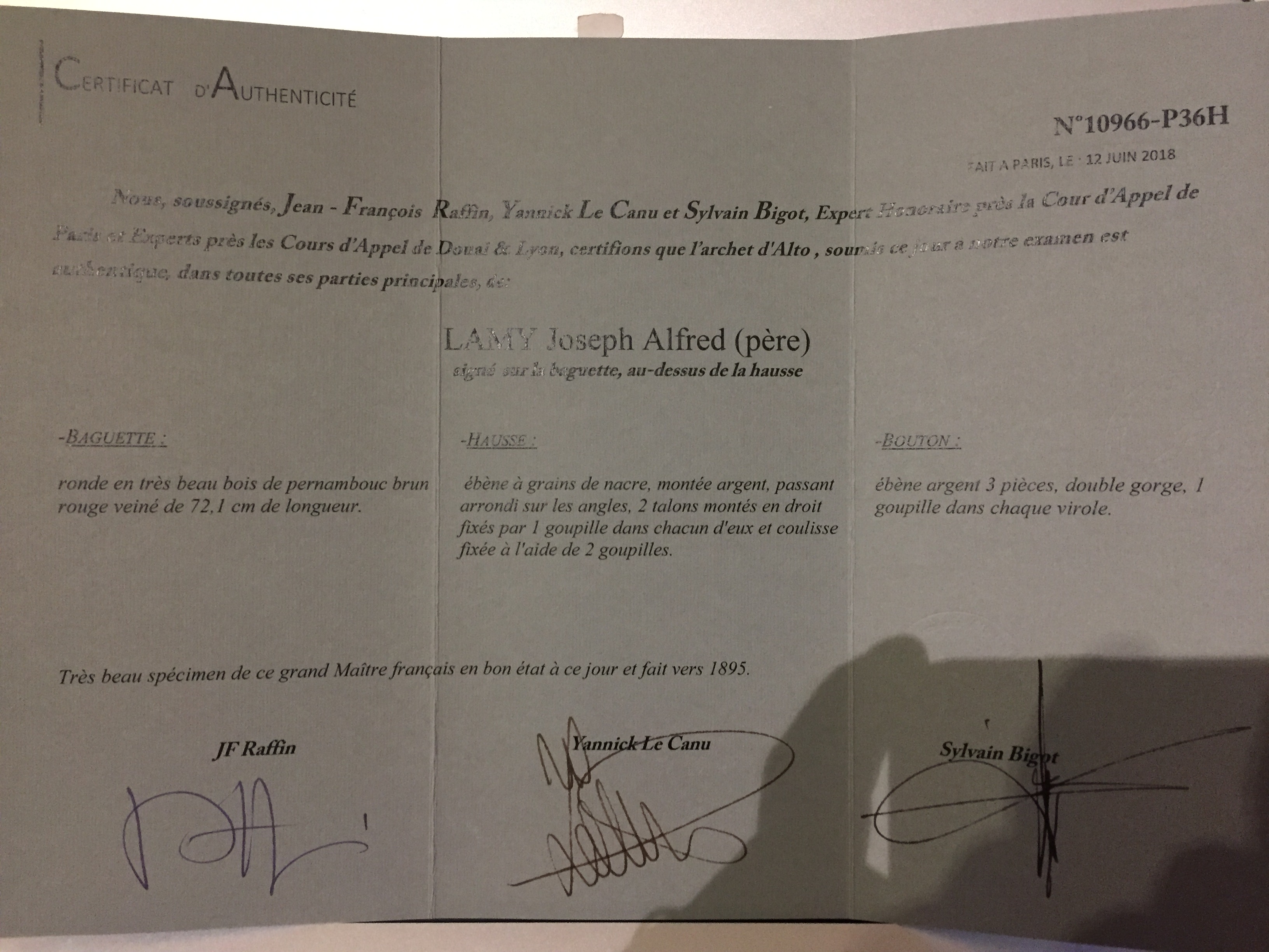French viola bow by Joseph Alfred LAMY (1850-1919) bearing the stamp "A LAMY A PARIS". With certificate.