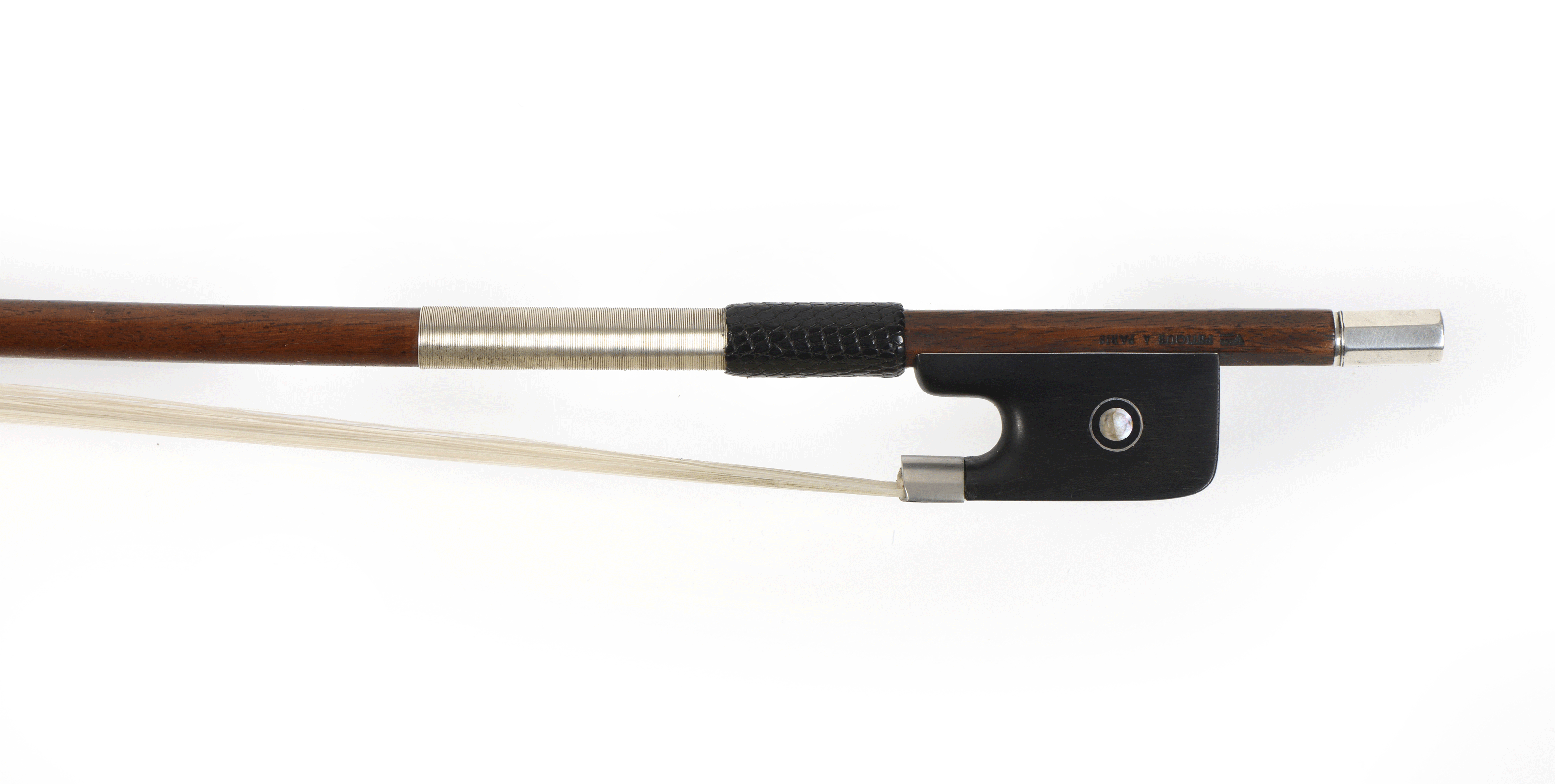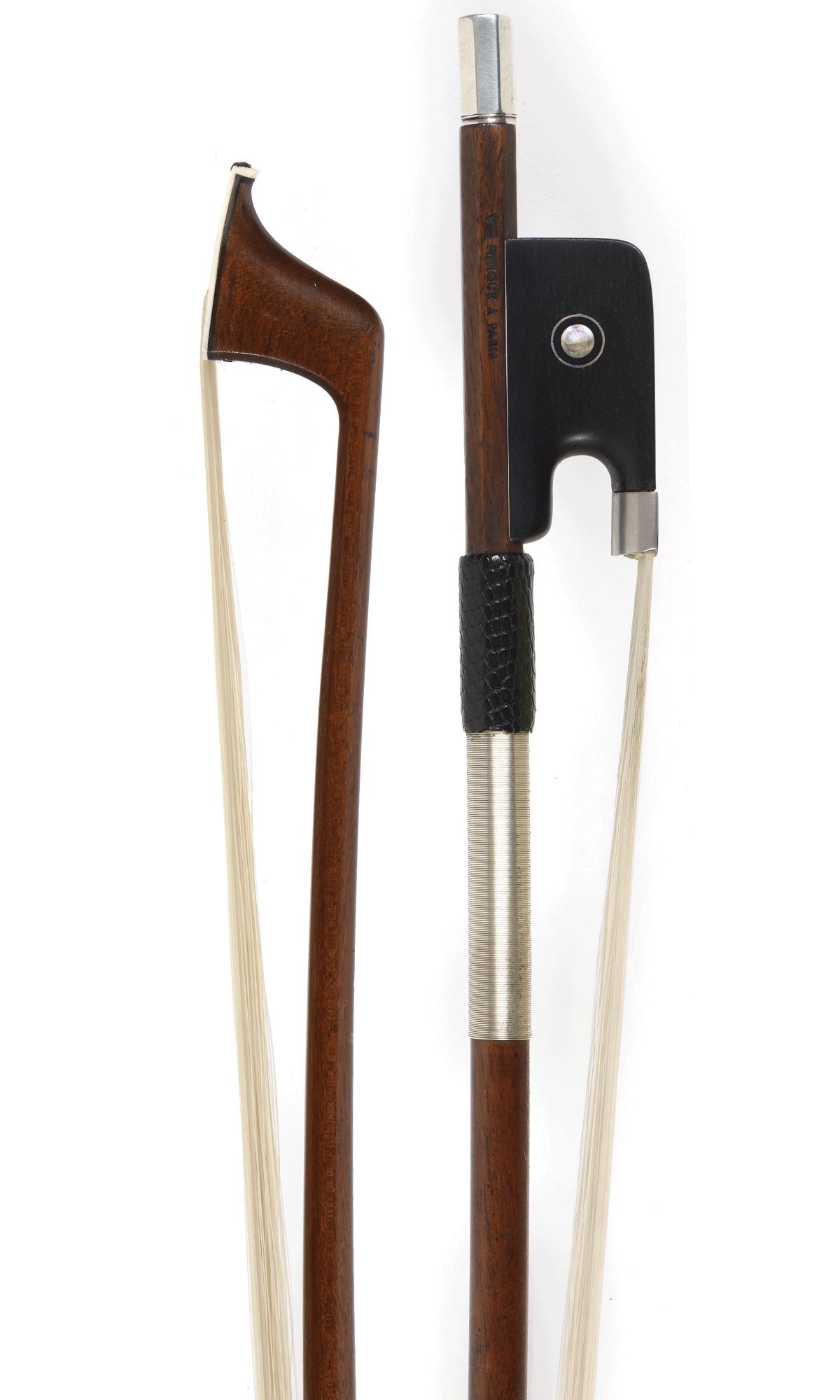 portant une marque apocryphe " Vtor FETIQUE à PARIS". Baguette ronde en pernabmouc. Hausse ébèhe montée argent avec grain cerclé. Restauration à la tête, Soulèvement d'une Lamelle de bois.