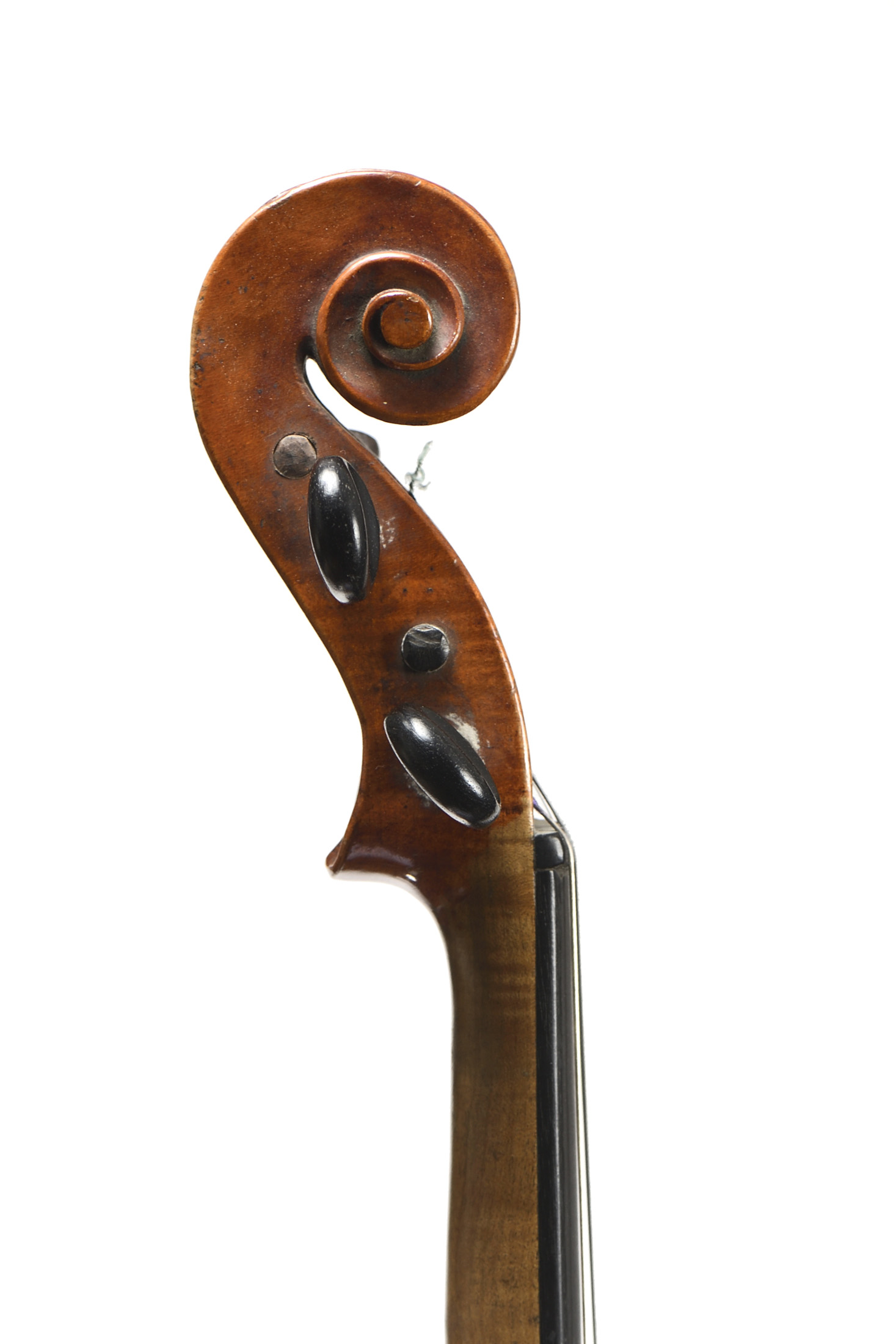 Fond de deux pièces en érable. Vernis brun orangé sur fond doré. Usures et cassure à l'éclisse. 360 mm.