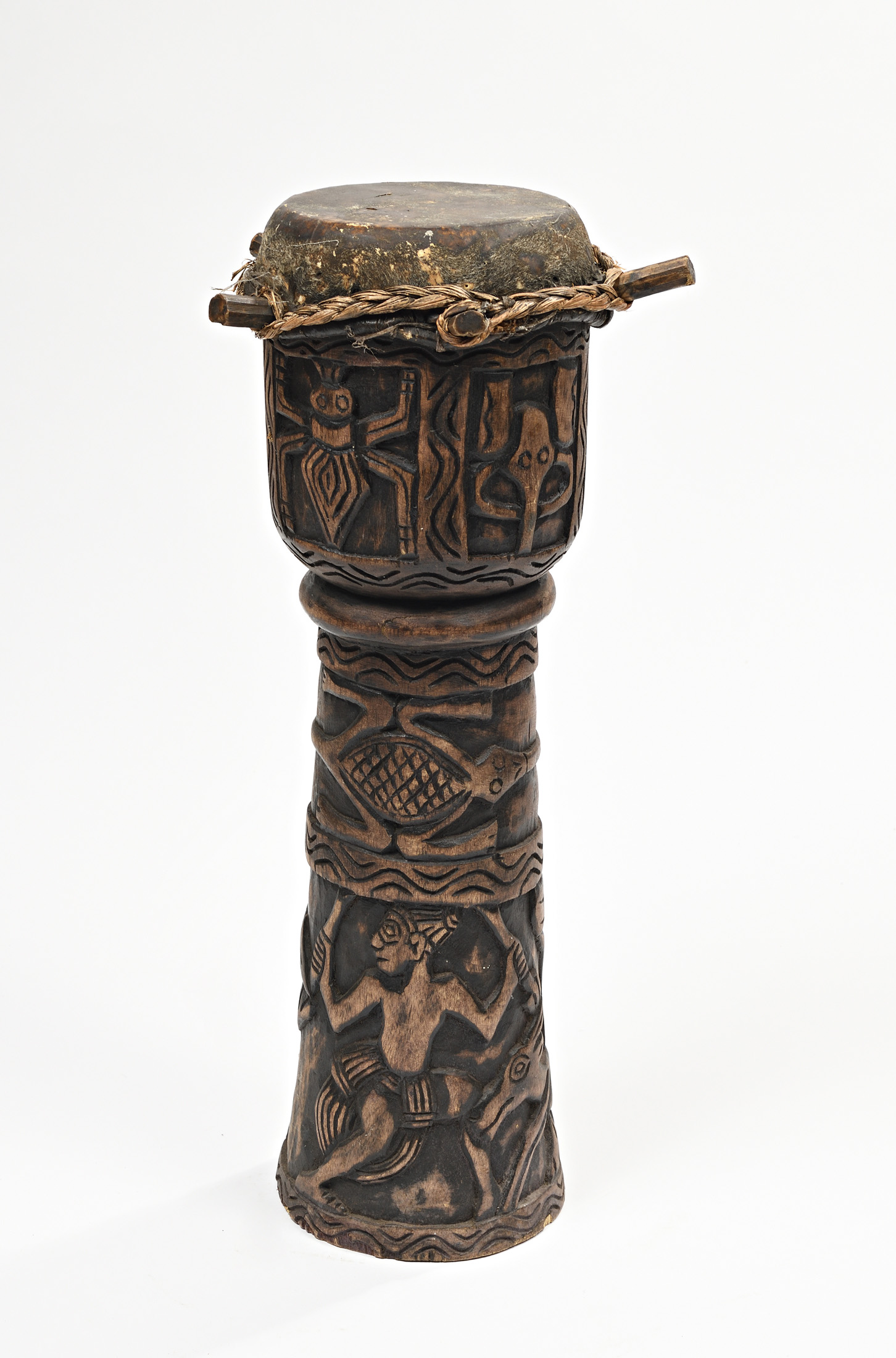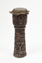 Tambour à pied cylindrique sculpté de motifs traditionnels. Bois patiné. Peau animale.