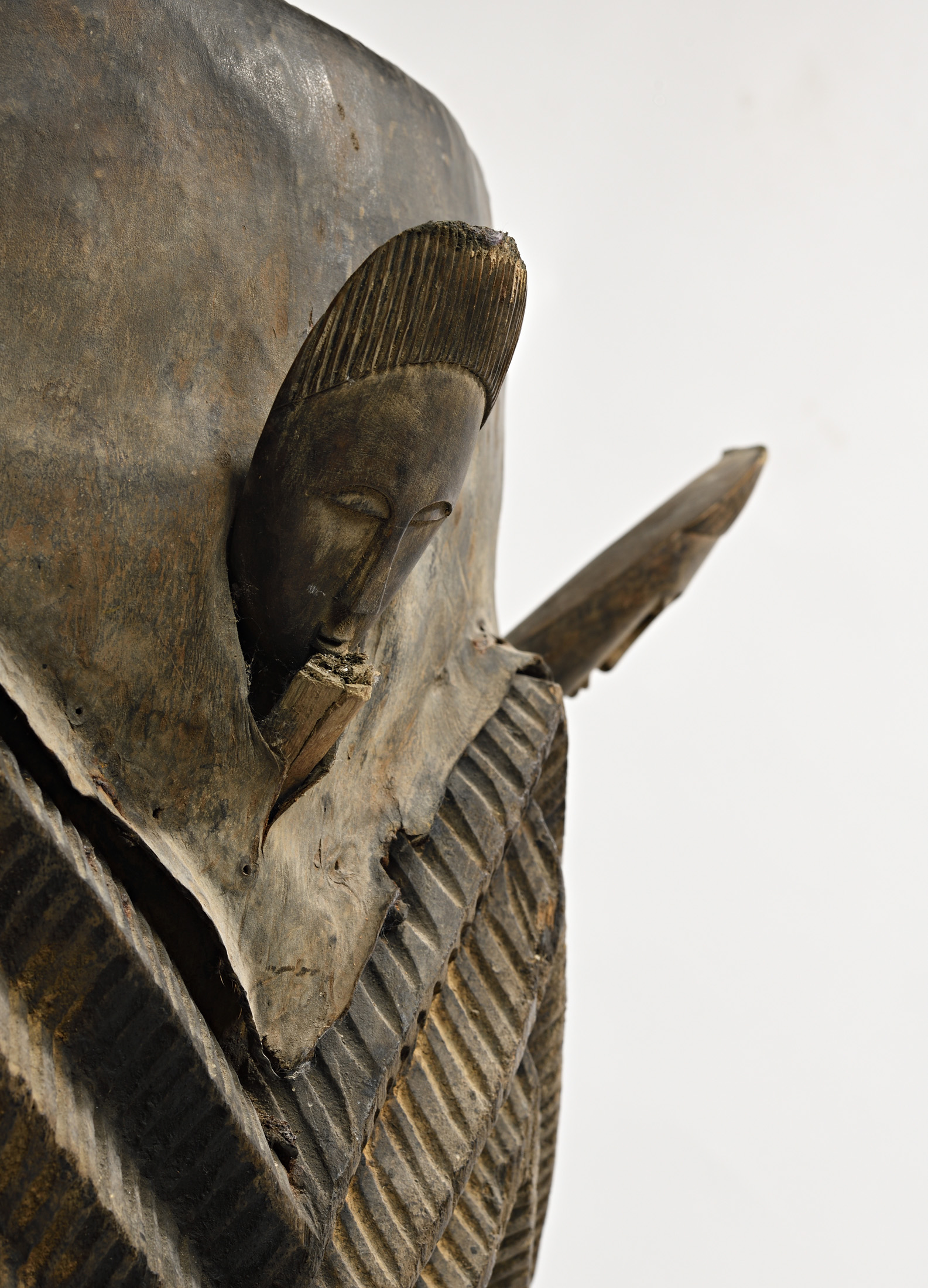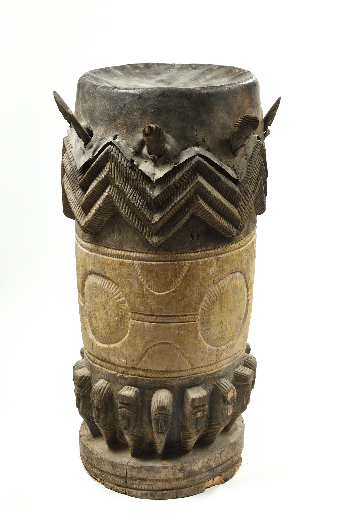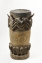 Grand tambour de cérémonie en bois, la partie haute du fut de raisonnance est sculpté d'un décors en zigzags évoquant la pluie et la foudre. Il est agrémenté d'idéogrammes ancestraux et d'une ronde de tête symbolisant la cohésion du clan. Ancienne patine d'usage brune et naturelle. Quelques érosions du temps localisées. Peau animale tannée par l'usage.