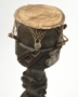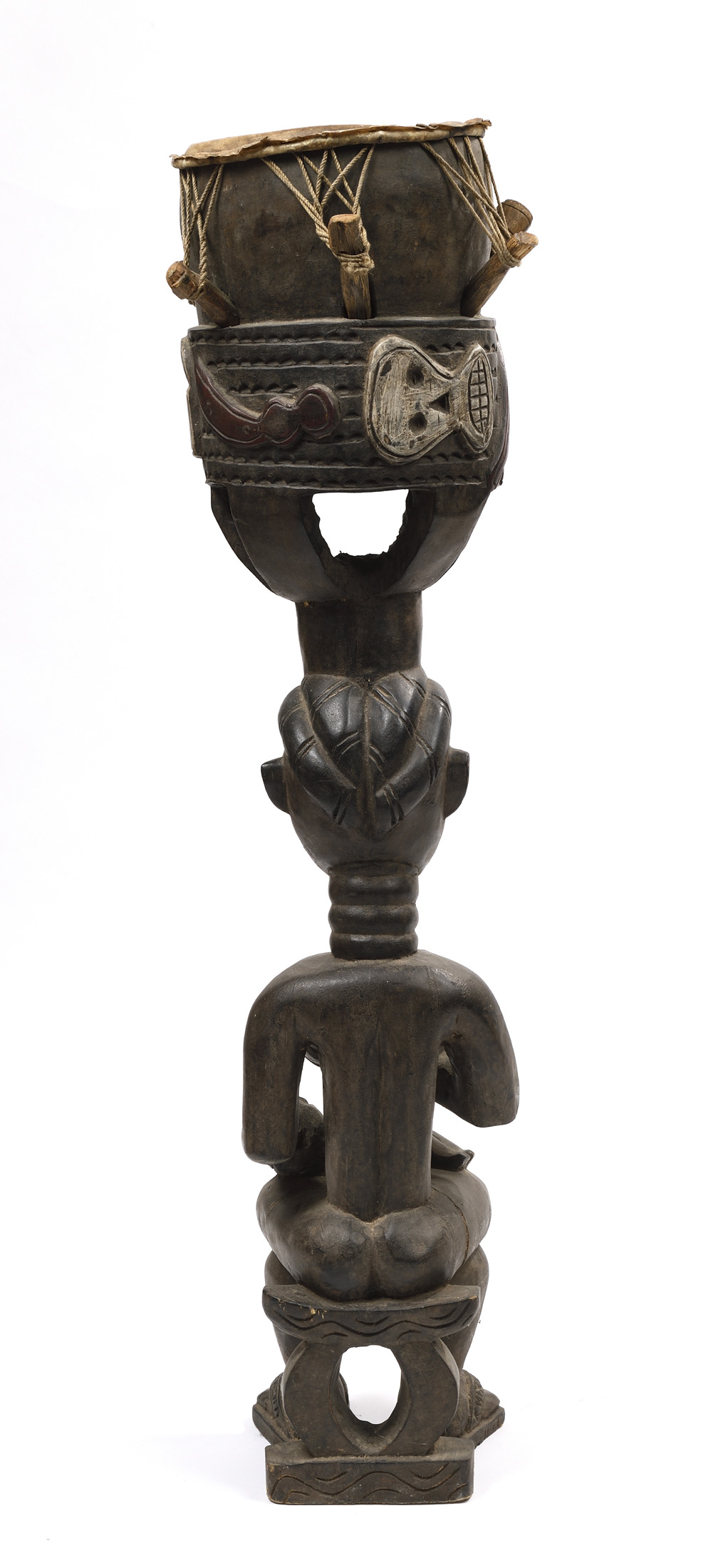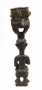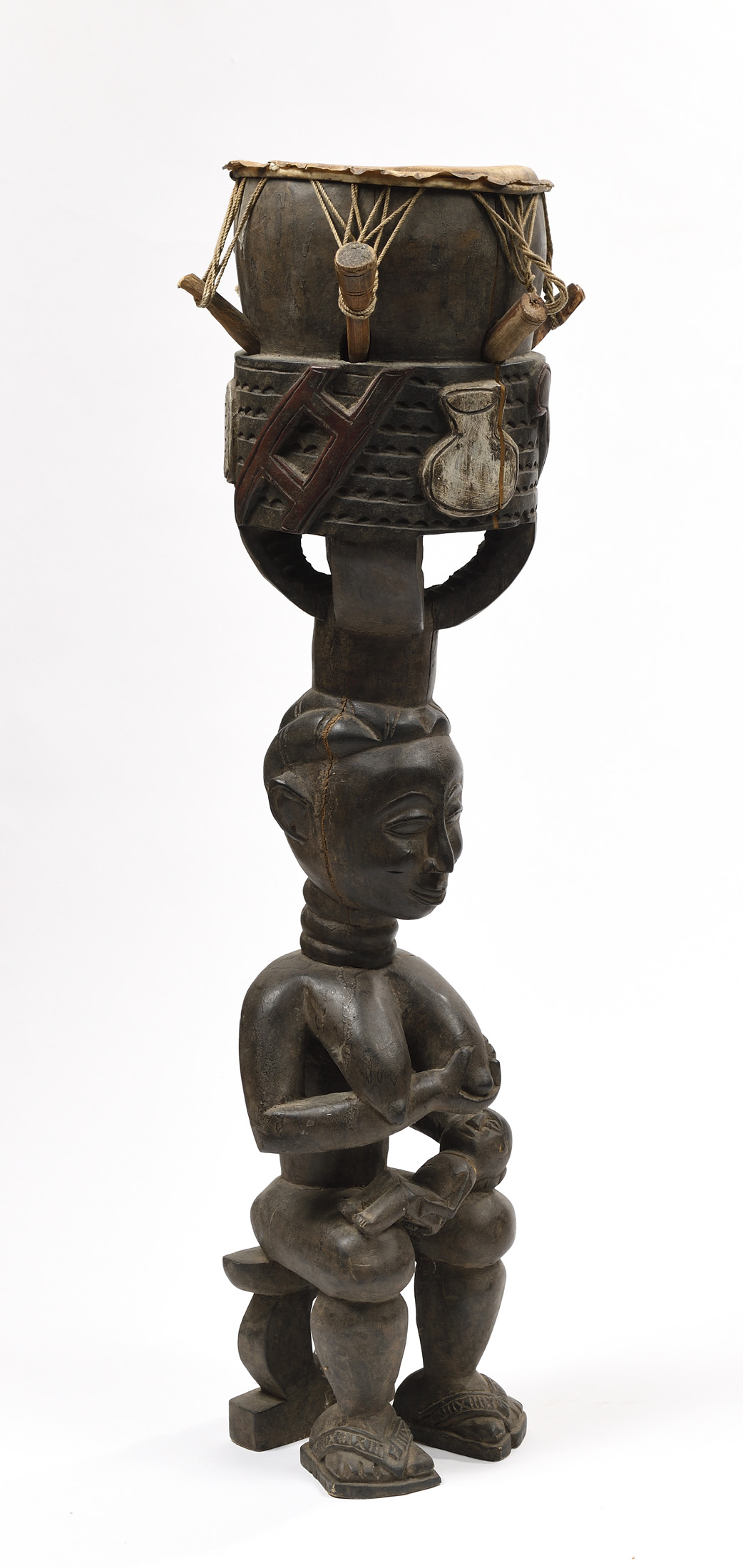 en bois sculpté d’une maternité allaitant son enfant et sur le fut de raisonnance : différents symboles sculptés en relief.