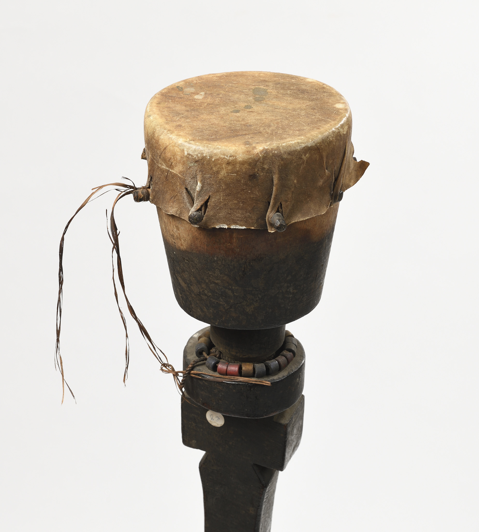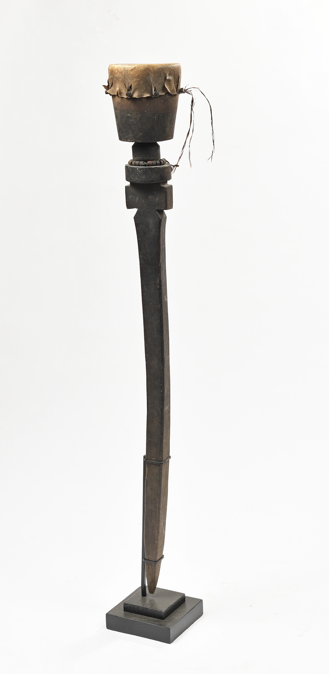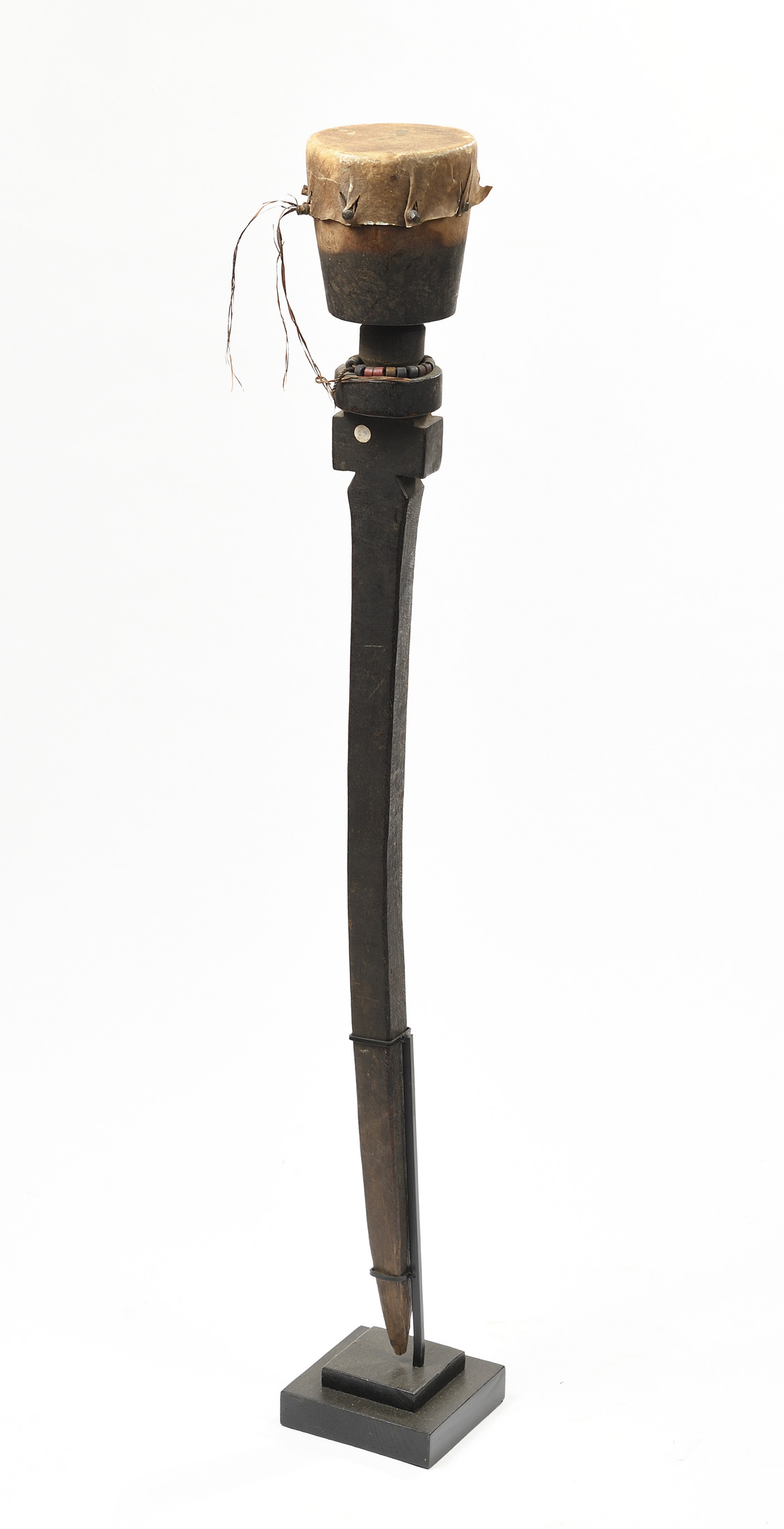 Tambour de cérémonie en bois, reposant sur un pilier, Bois et peau animale. Anciennes marques d'usage.