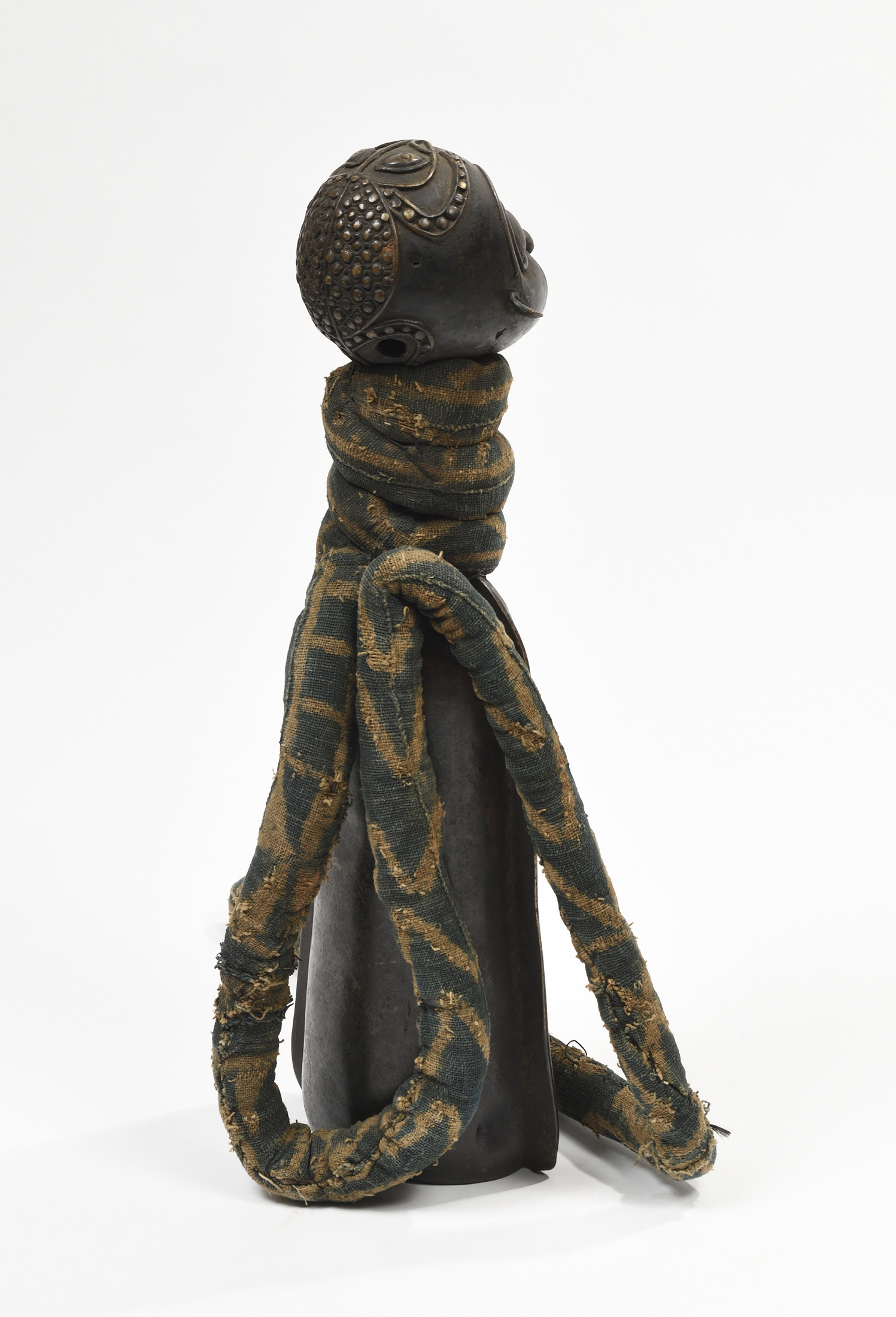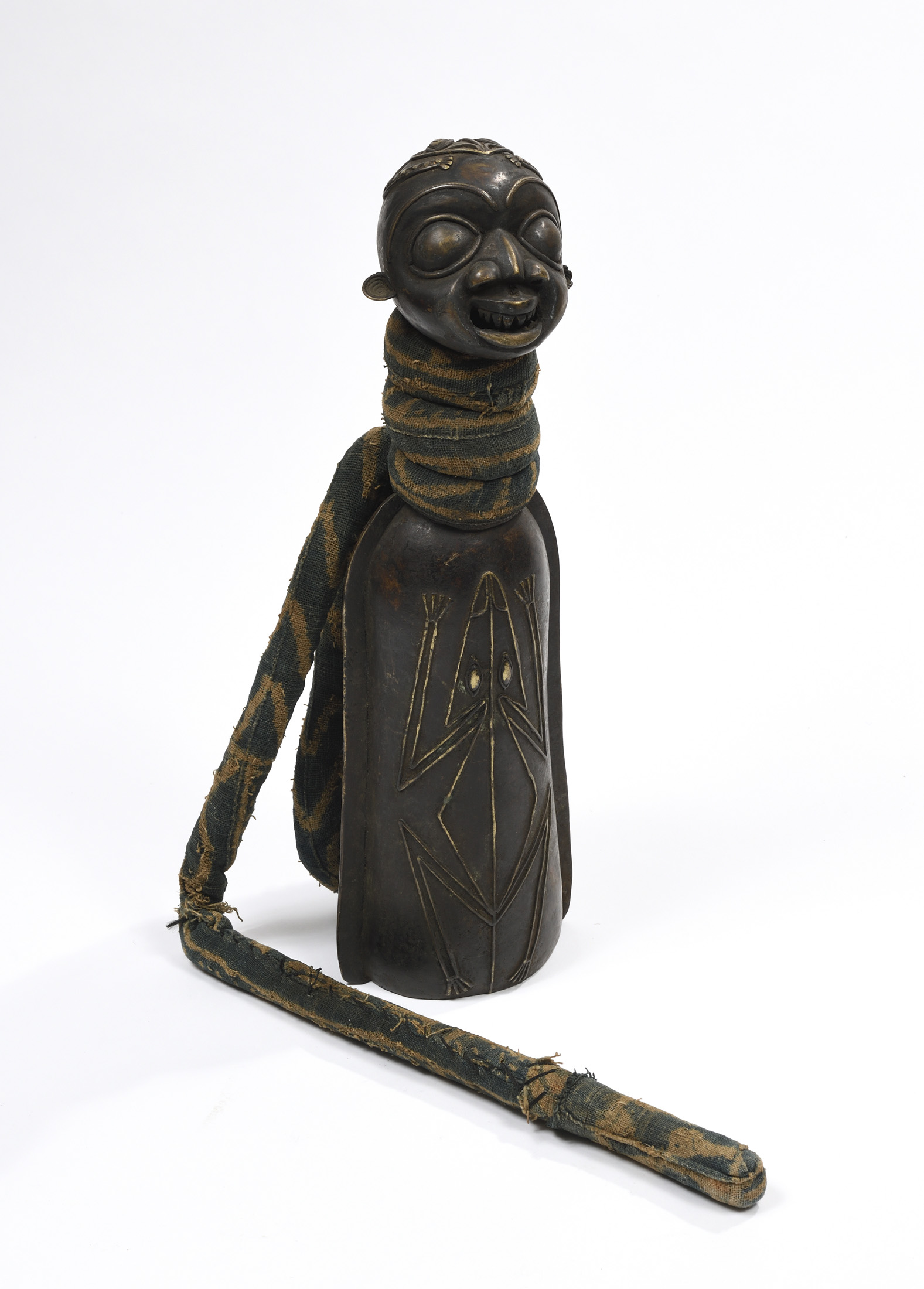 présentant une tête ancestrale et un crocodile stylisé sur le fut. Fer forgé, bronze et tissu.