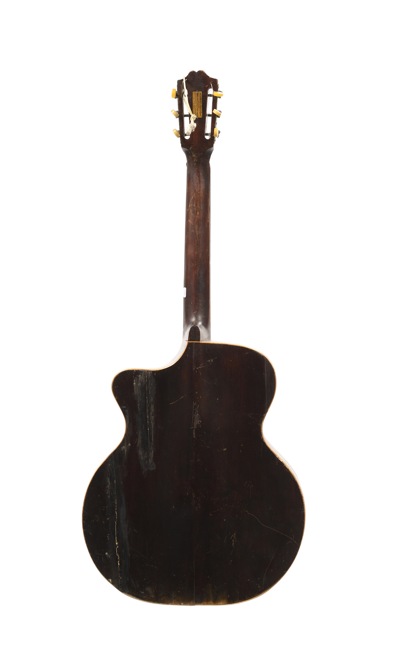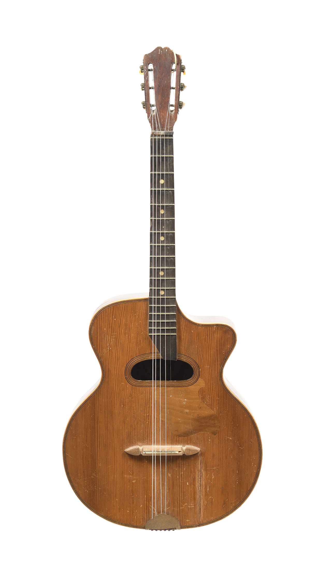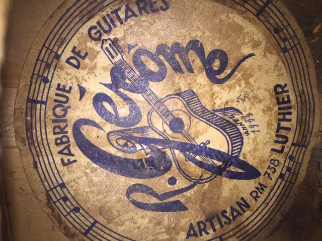 portant l'étiquette "Fabrique de Guitare R.GEROME Artisan RM 738.". Fond de deux pièces. Table en sapin aux pores larges et irréguliers. En l'état: diverses cassures.