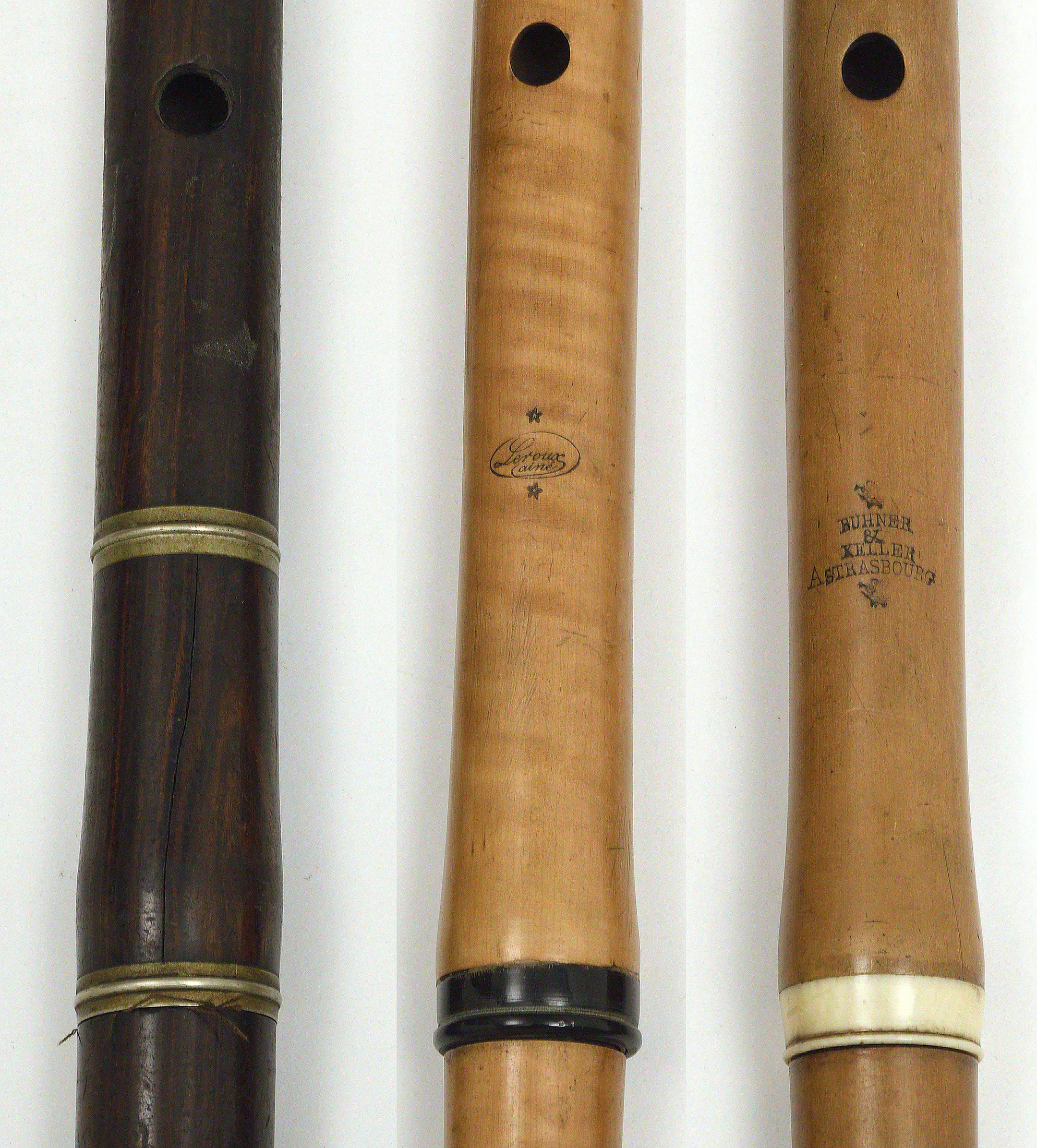 Deux flûtes en buis avec clefs en laiton, l'une marquée BUHNER et KELLER à Strasbourg et l'autre LEROUX Ainé.