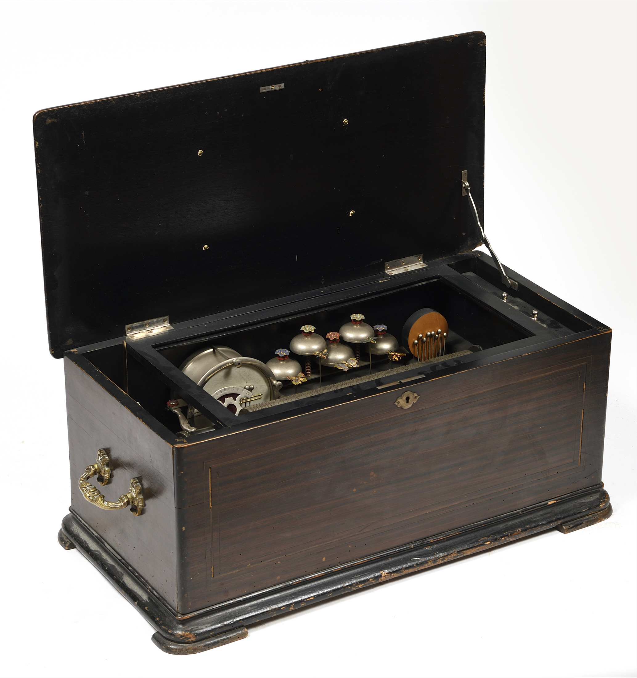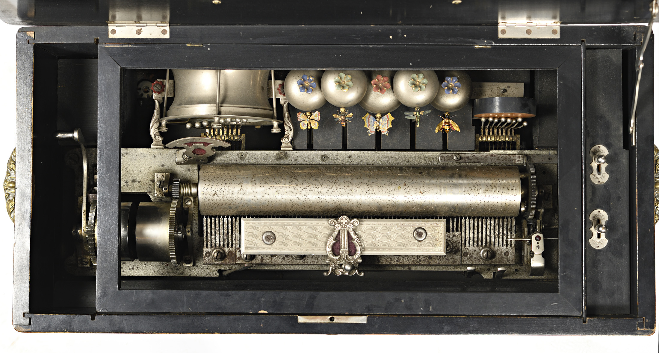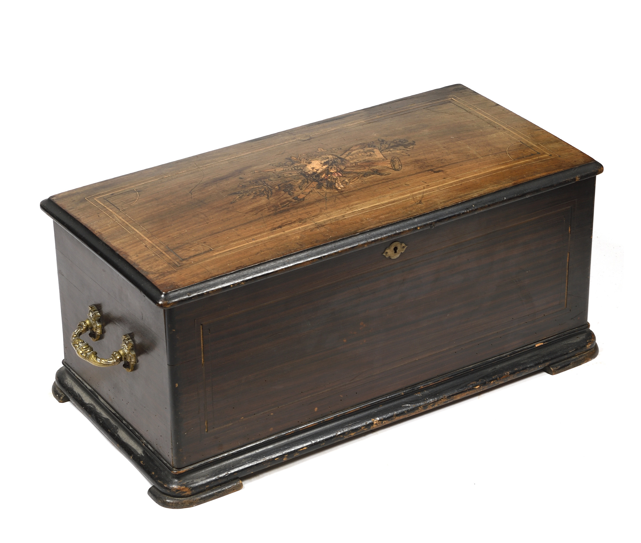 En bois de placage, marqueté d'une composition florale avec des instruments à vent.