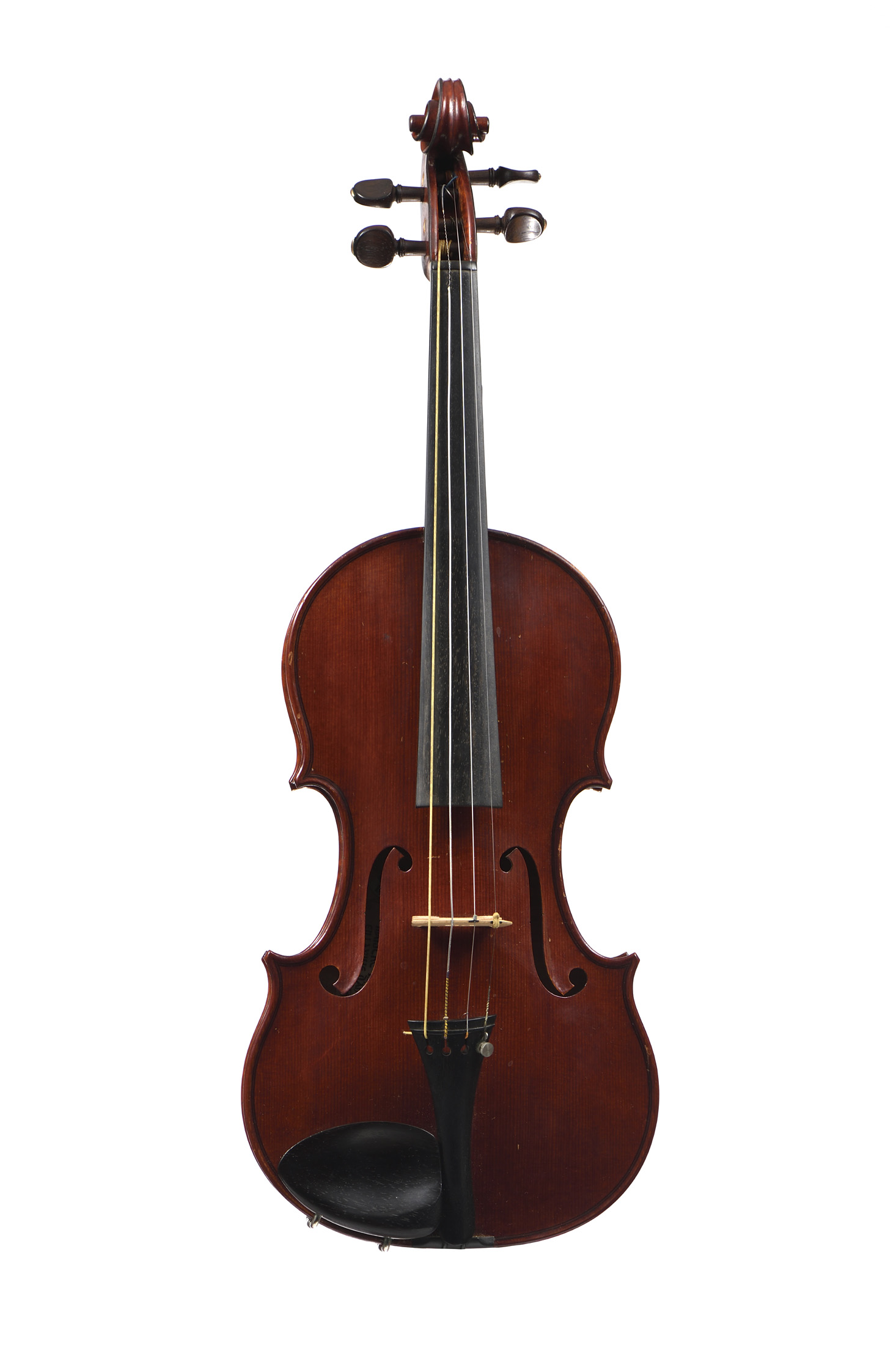 dont il porte l'étiquette originale "Jean BAUER Maitre luthier en la ville d'Angers. N° 145. Année 1956." et la signature manuscrite, marque au fer "JEAN BAUER Angers" au bouton. Fond de deux pièces en bel érable aux ondes régulières. Vernis brun rouge. Avec son chevalet d'origine. 356 mm.