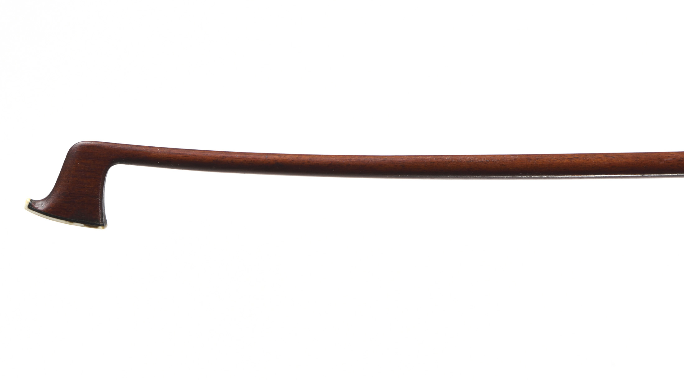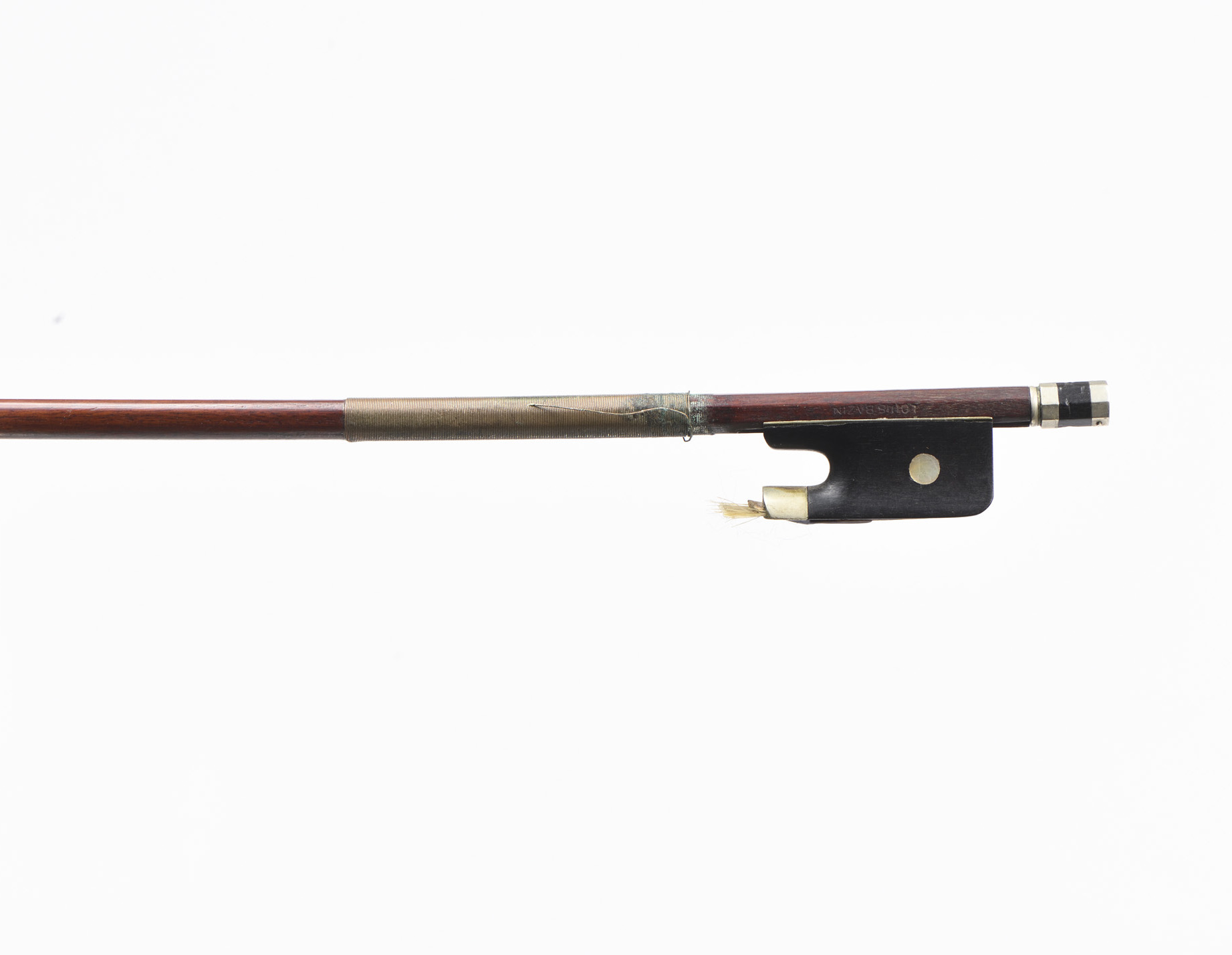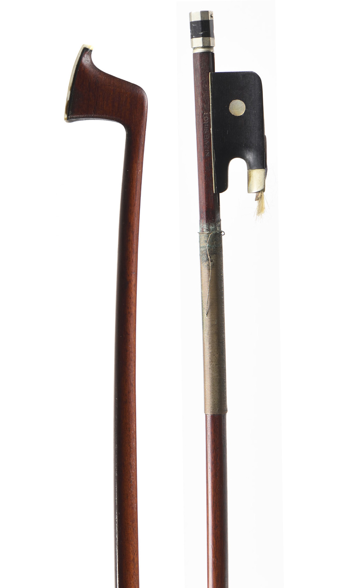 dont il porte la marque au fer "LOUIS BAZIN". Baguette ronde en bois de pernambouc. Hausse ébène montée maillechort. Restauration au pan. Hausse ébène montée maillechort d'un autre auteur. 48 g sans mèche, avec garniture argent sur soie. 730 mm.