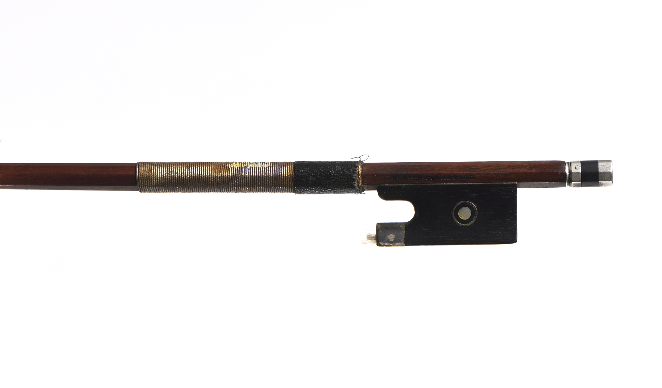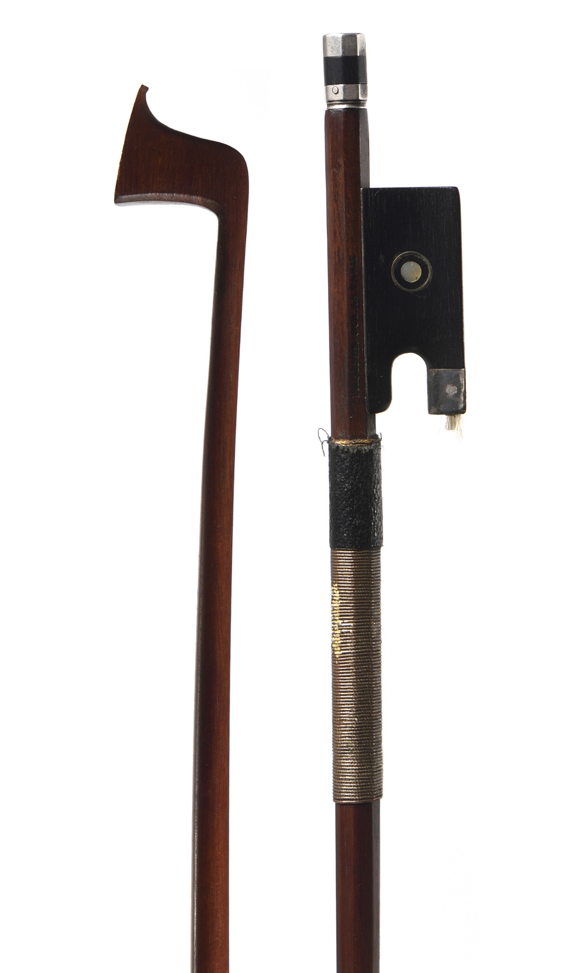 dont il porte la marque au fer "PROSPER COLAS PARIS". Baguette ronde en beau bois de pernambouc. Hausse ébène montée argent. 721 mm. 52 g sans plaque de tête, sans mèche et garniture argent sur soie.