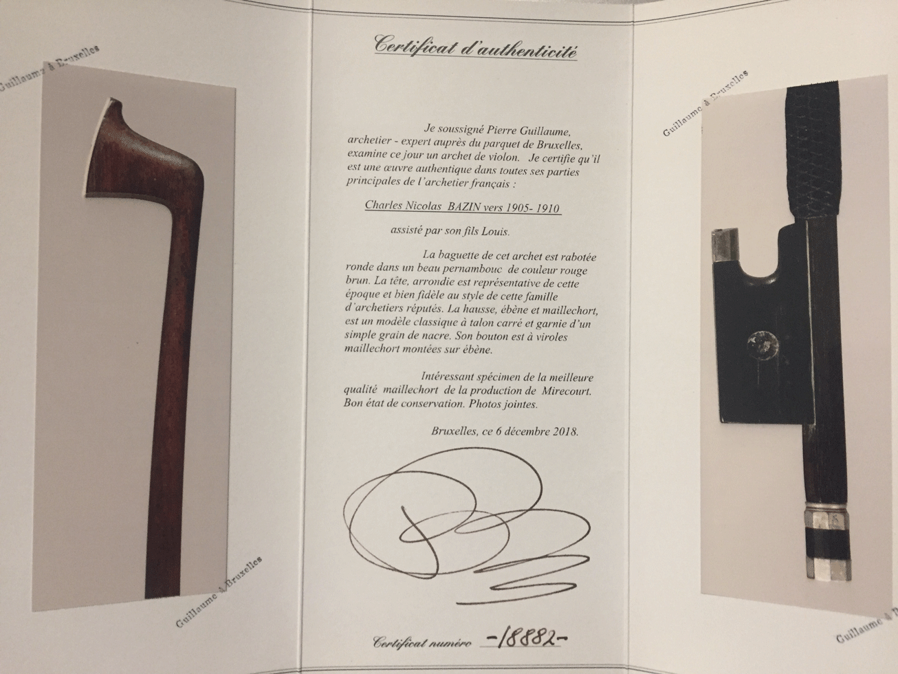 French violin bow by Charles Nicolas Bazin. Pierre Guillaume Certificate.