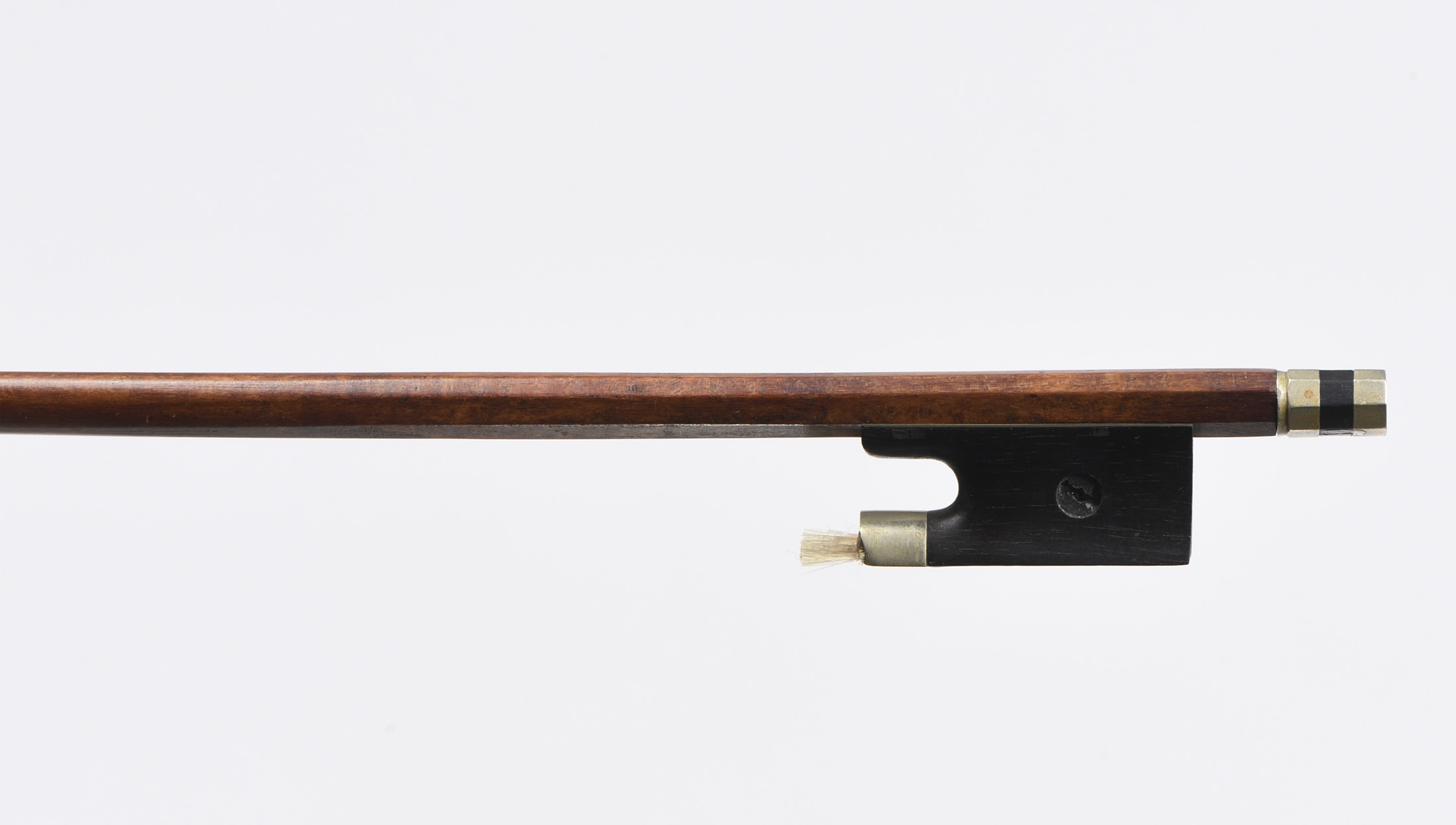 Baguette ronde en bois de pernambouc. Hausse ébène montée maillechort. 725 mm. 51 g sans mèche ni garniture.