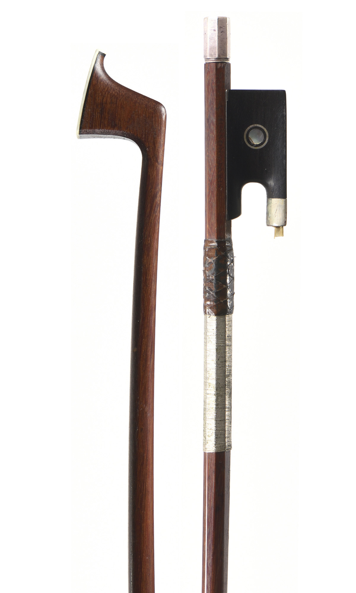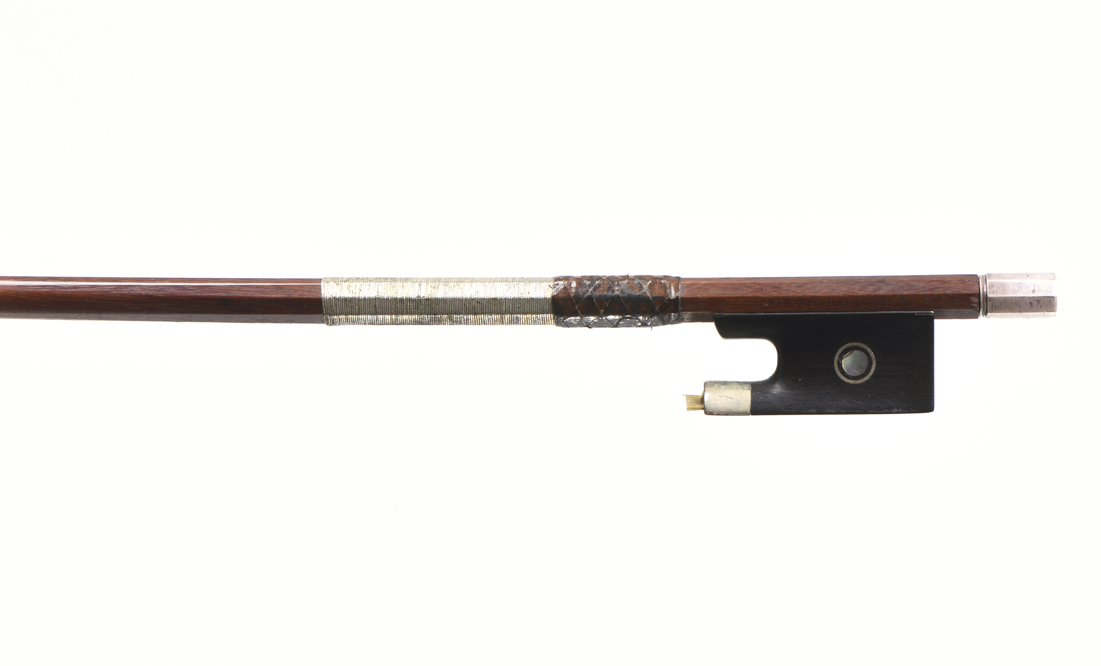 portant une marque "A.HUSSON PARIS". Baguette ronde en bois de pernambouc. Hausse ébène montée argent. 726 mm. 54 g sans mèche et garniture argent sur soie.