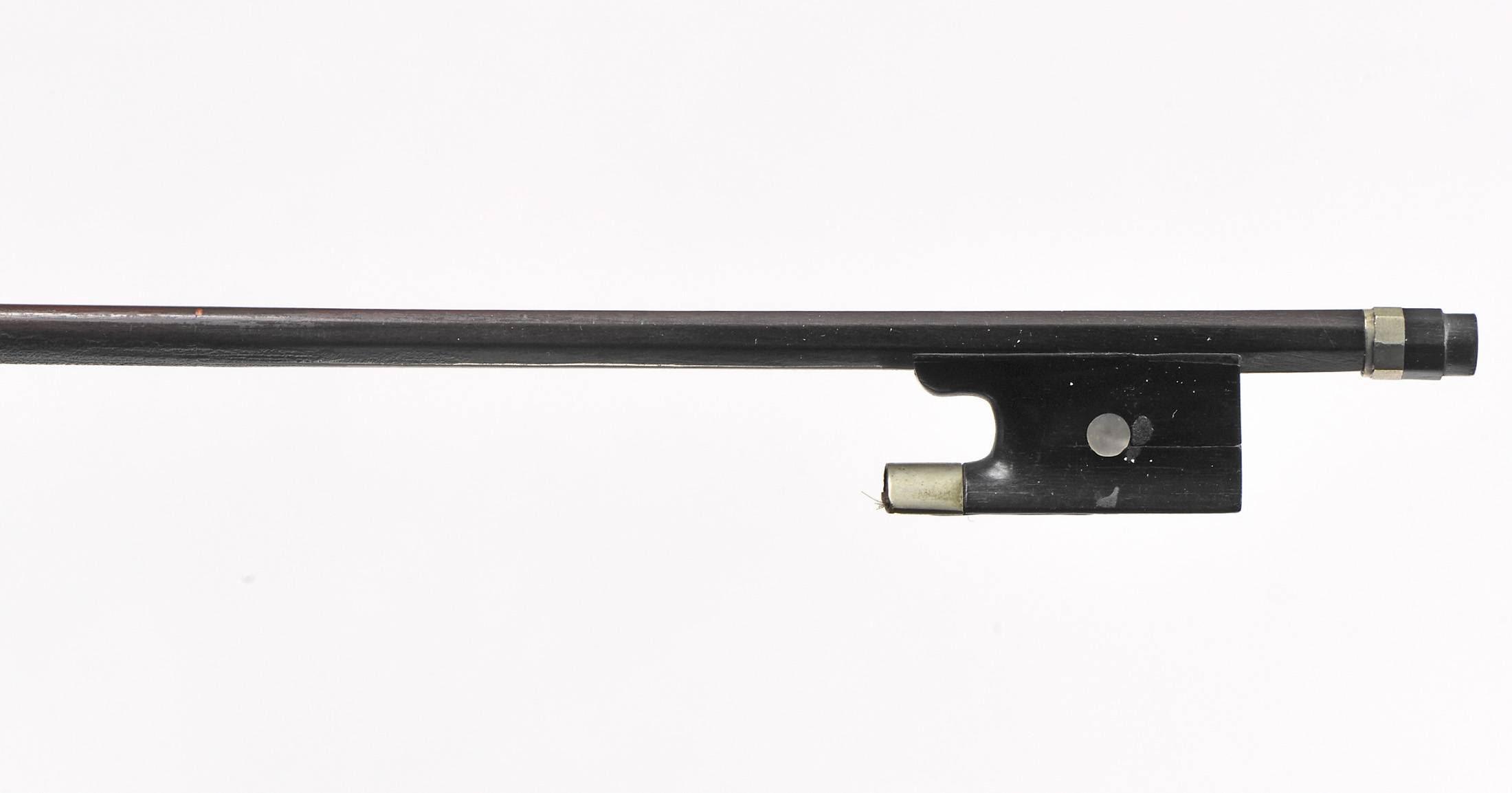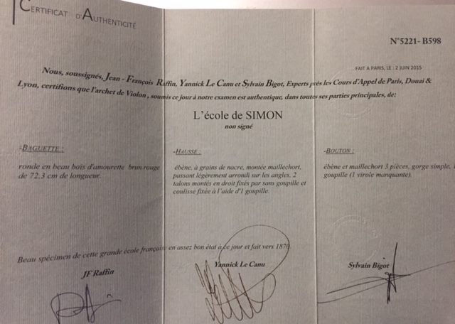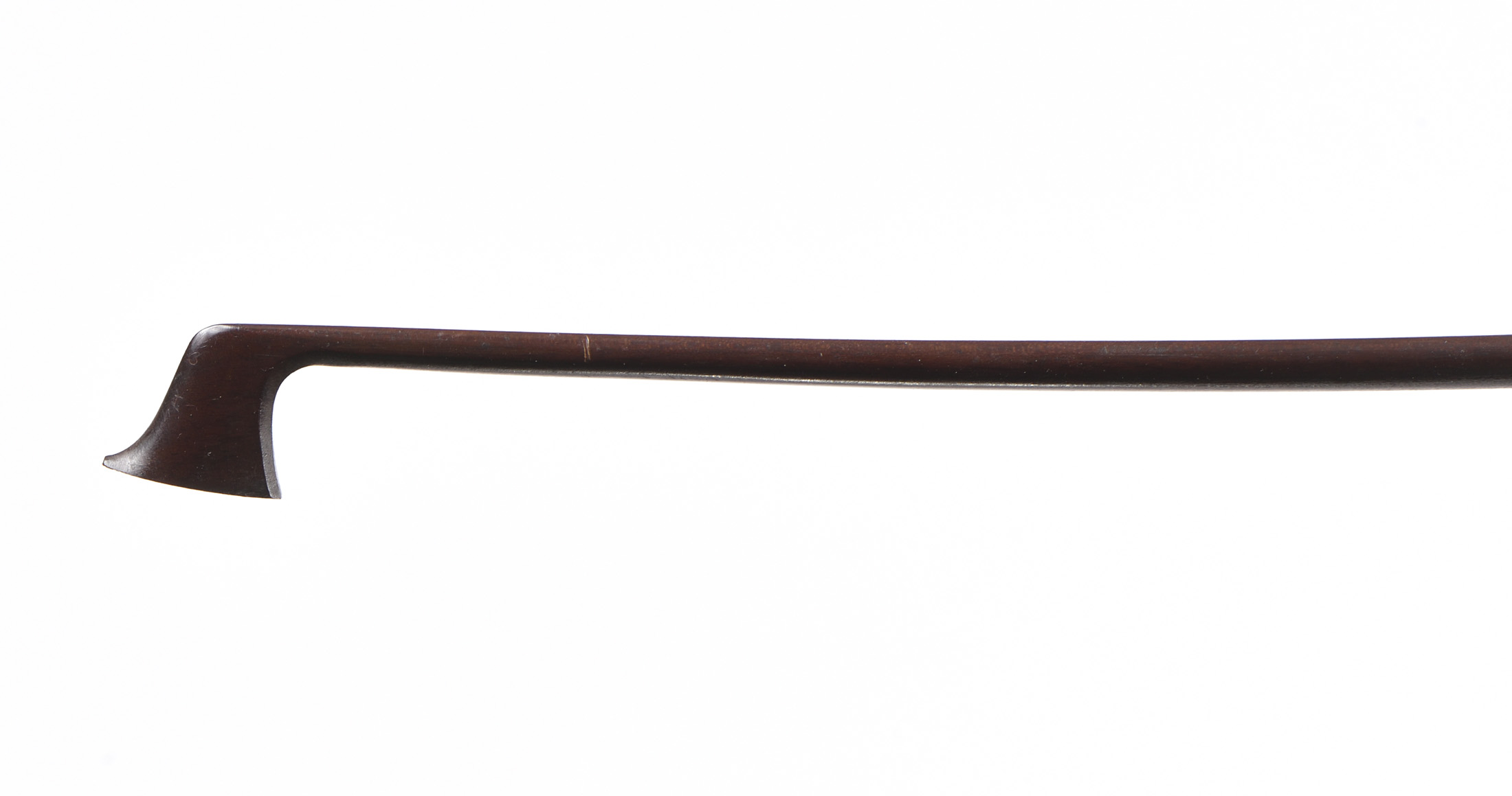 Baguette ronde en bois d'amourette. Hausse ébène montée maillechort. Manque une virole au bouton. Hausse accidentée. Avec certificat d'authenticité de Jean-Francois RAFFIN. 724 mm.50 g sans mèche, ni garniture.