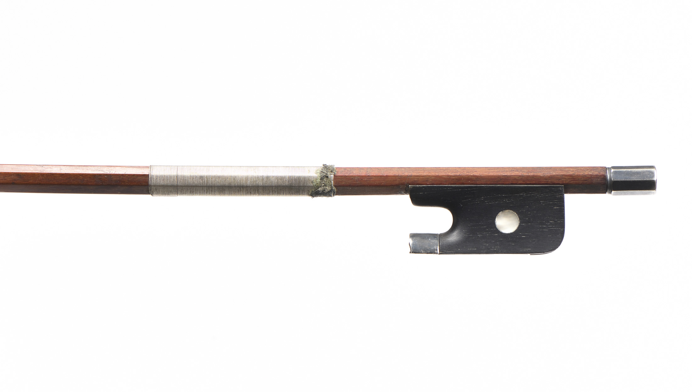 Baguette octogonale en bois de pernambouc. Hausse ébène montée argent. 730 mm. 53 g sans mèche.