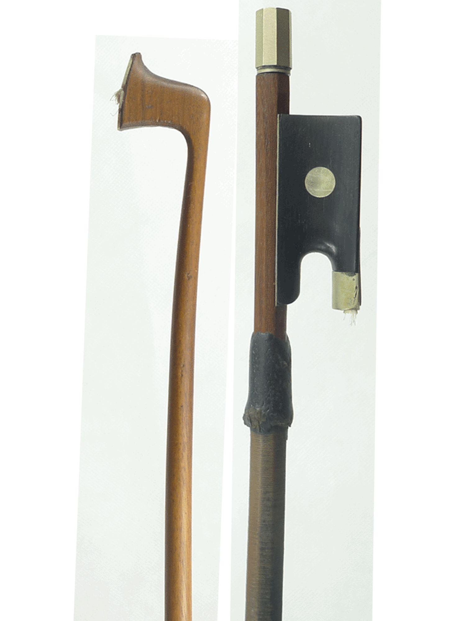 Baguette ronde en bois de pernambouc. Hausse ébène montée maillechort. 724 mm. 51 g sans mèche, ni garniture.