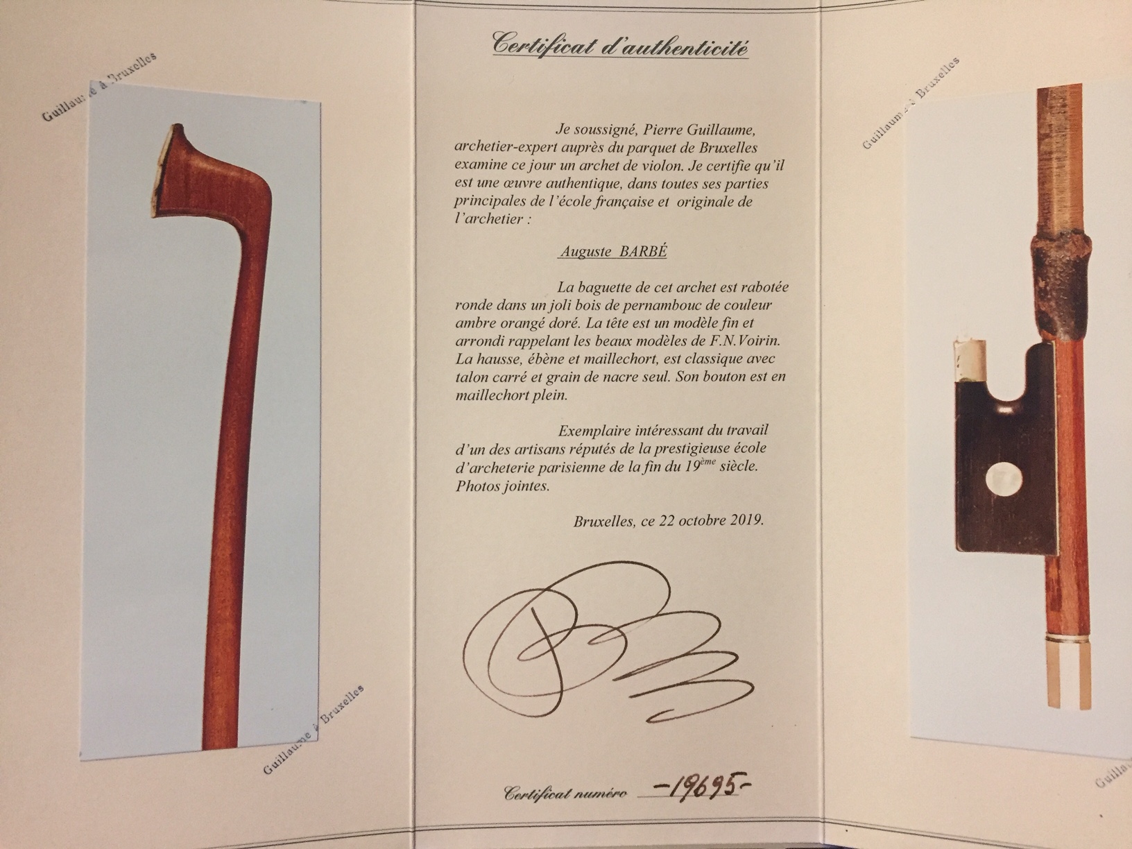 French violin bow by Auguste BARBE. Pierre Guillaume certificate.