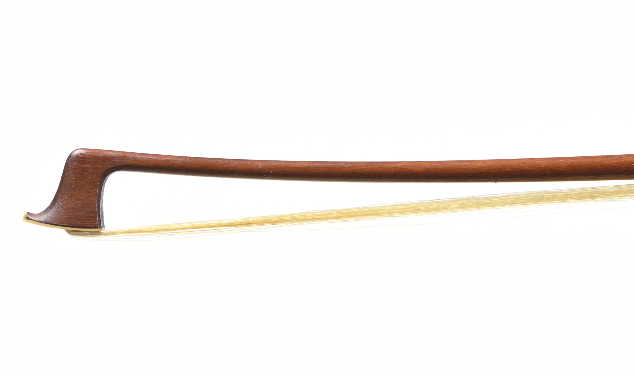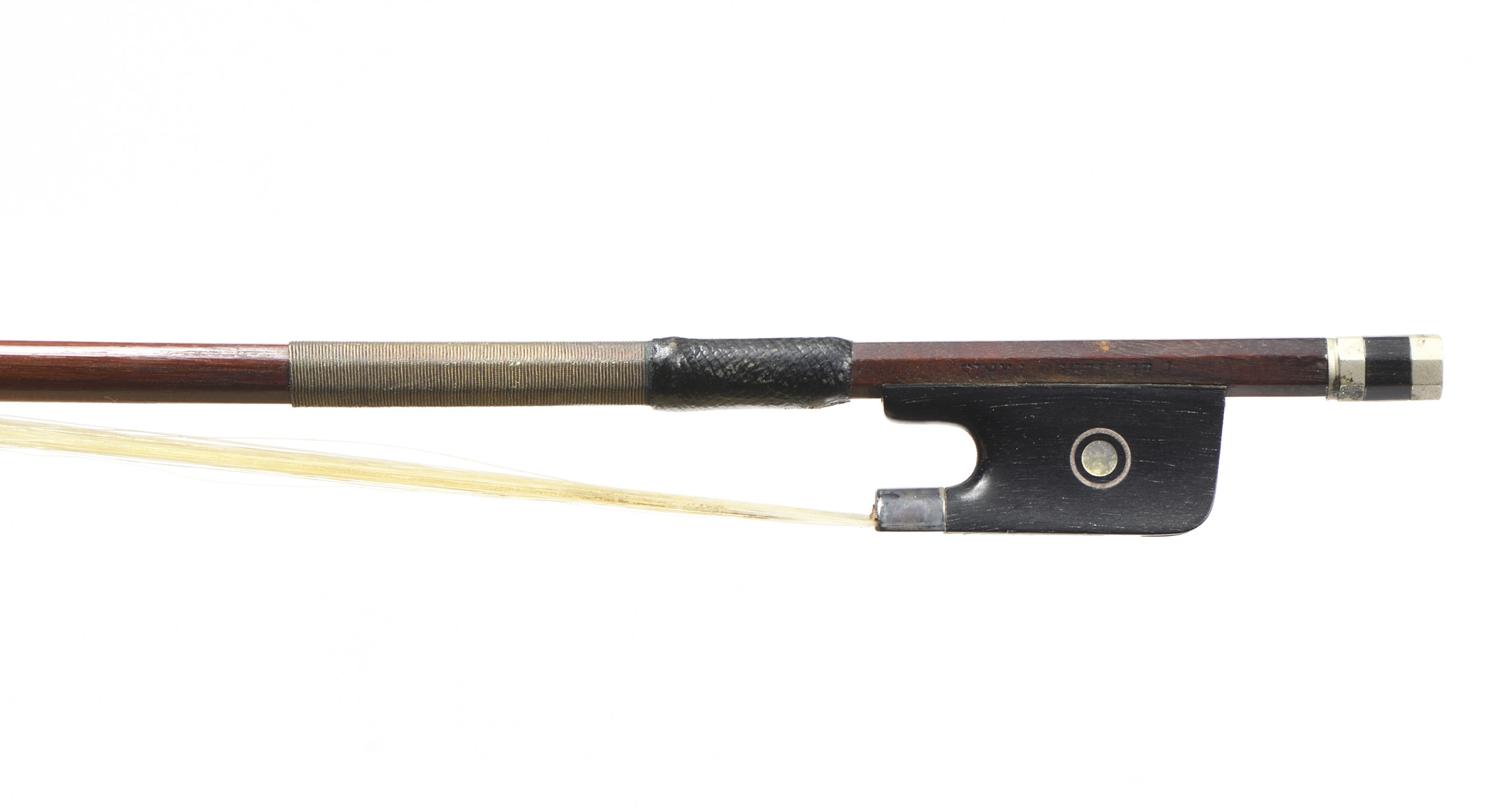 portant la marque au fer "Paul BEUSCHER A PARIS.". Baguette ronde en bois de pernambouc. Hausse ébène montée argent. Bouton d'un autre auteur en maillechort. 58,5 g. Garniture argent sur soie. 730 mm.