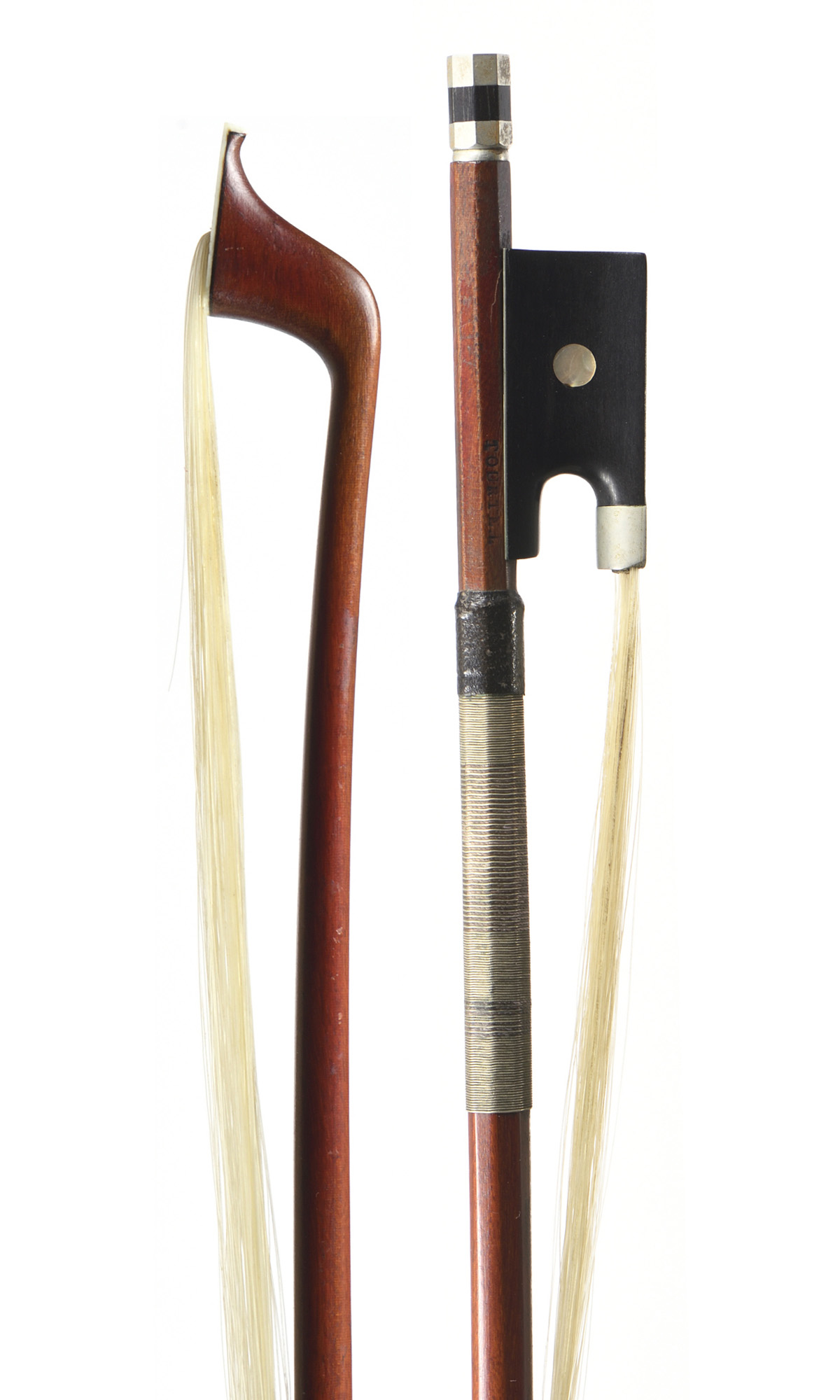 probablement fait par Charles Nicolas BAZIN. Portant la marque au fer "TOURTE.L". Baguette ronde en beau bois de pernambouc. Hausse ébène montée maillechort. 734 mm. 54 g avec garniture argent sur soie.