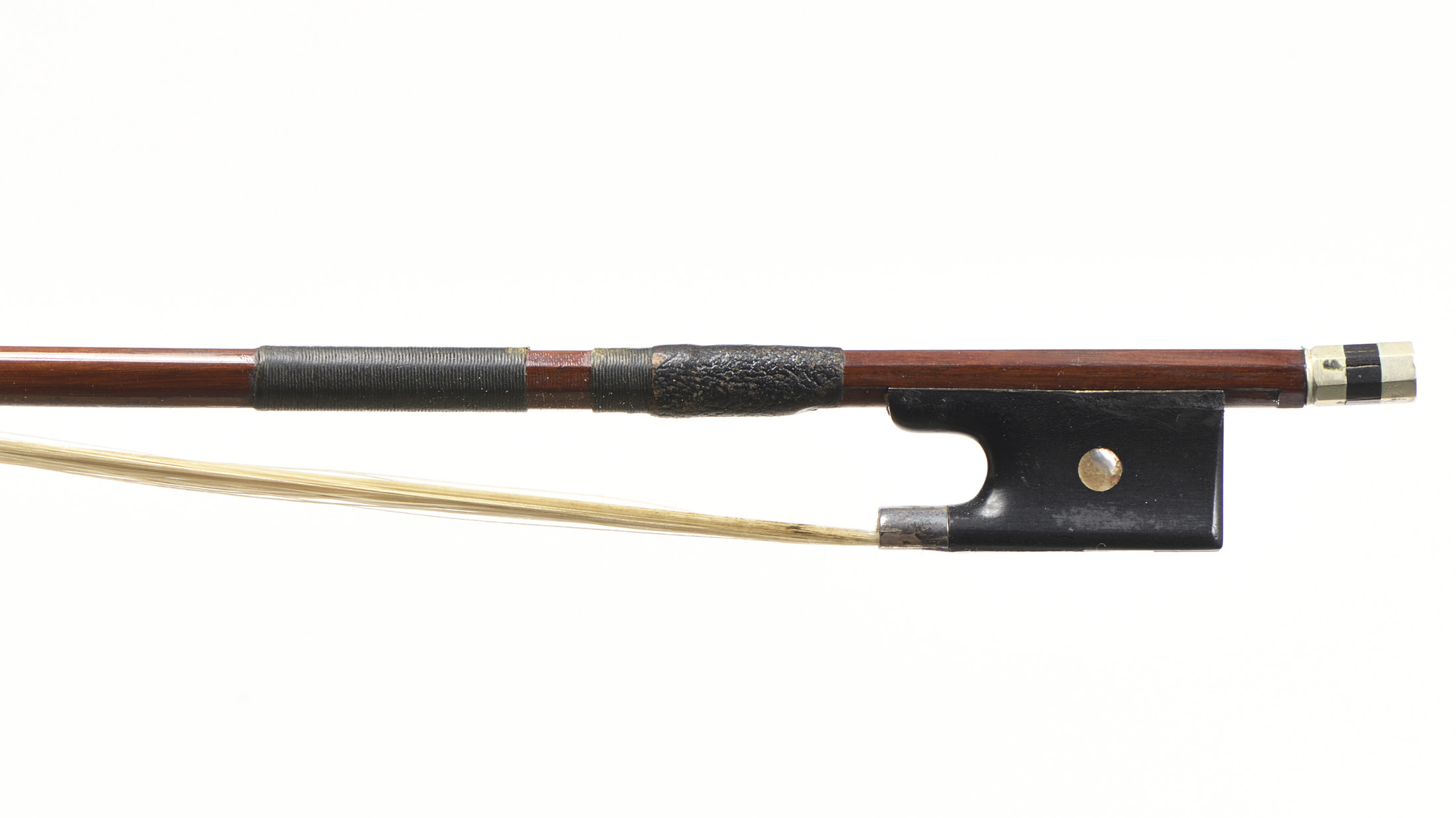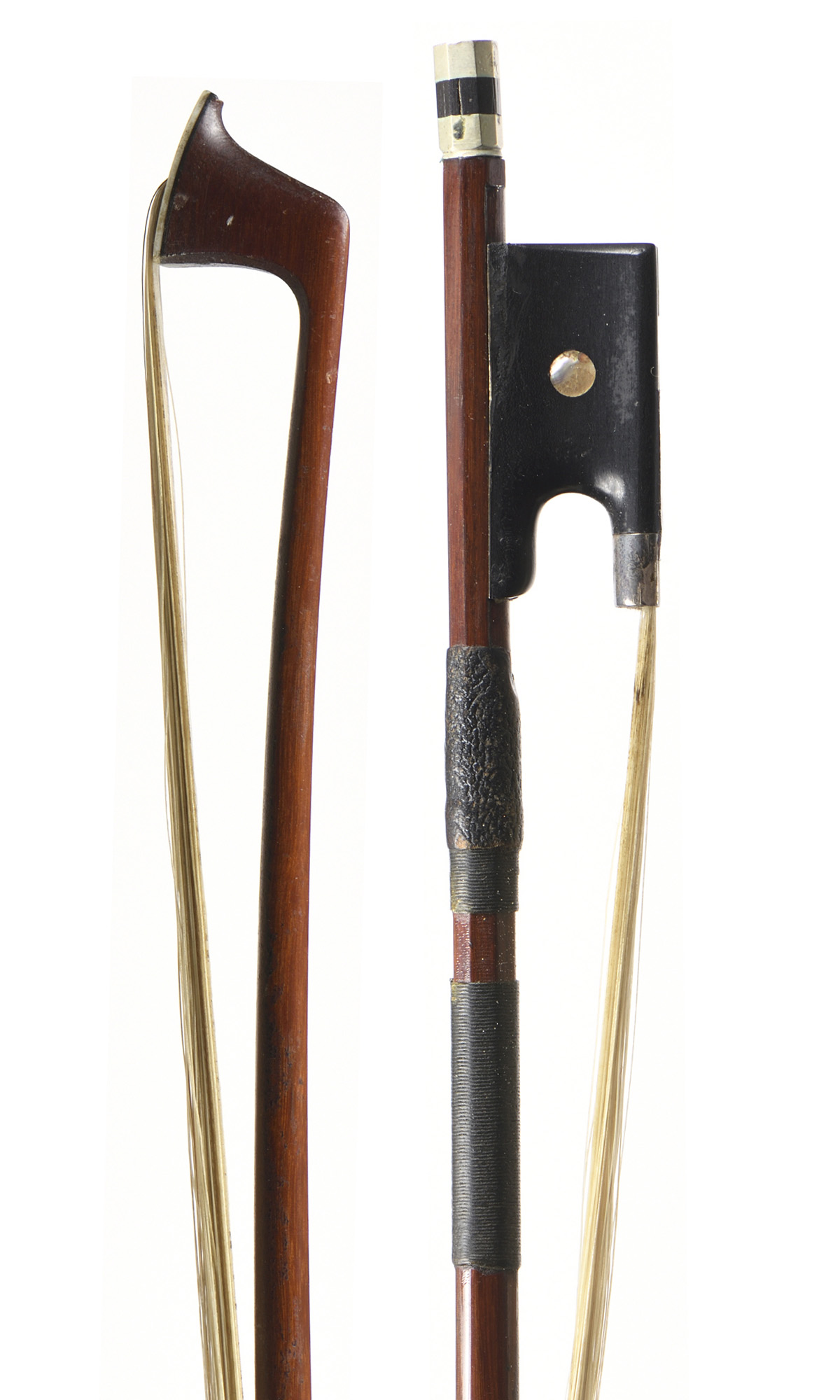 dont il porte la marque au fer "J.Thibouville.Ly". Baguette ronde en bois de pernambouc. Hausse ébène montée argent. Bouton d'un autre auteur. 728 mm. 58 g.