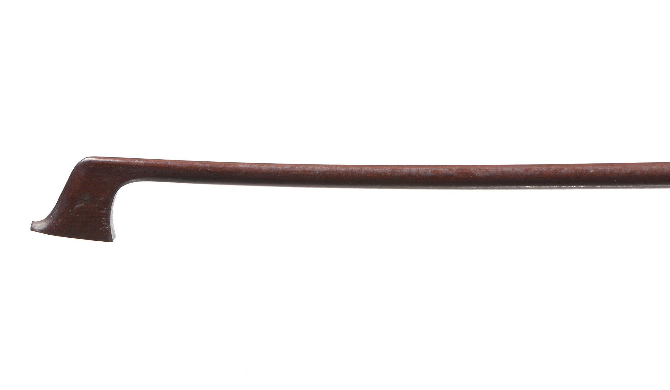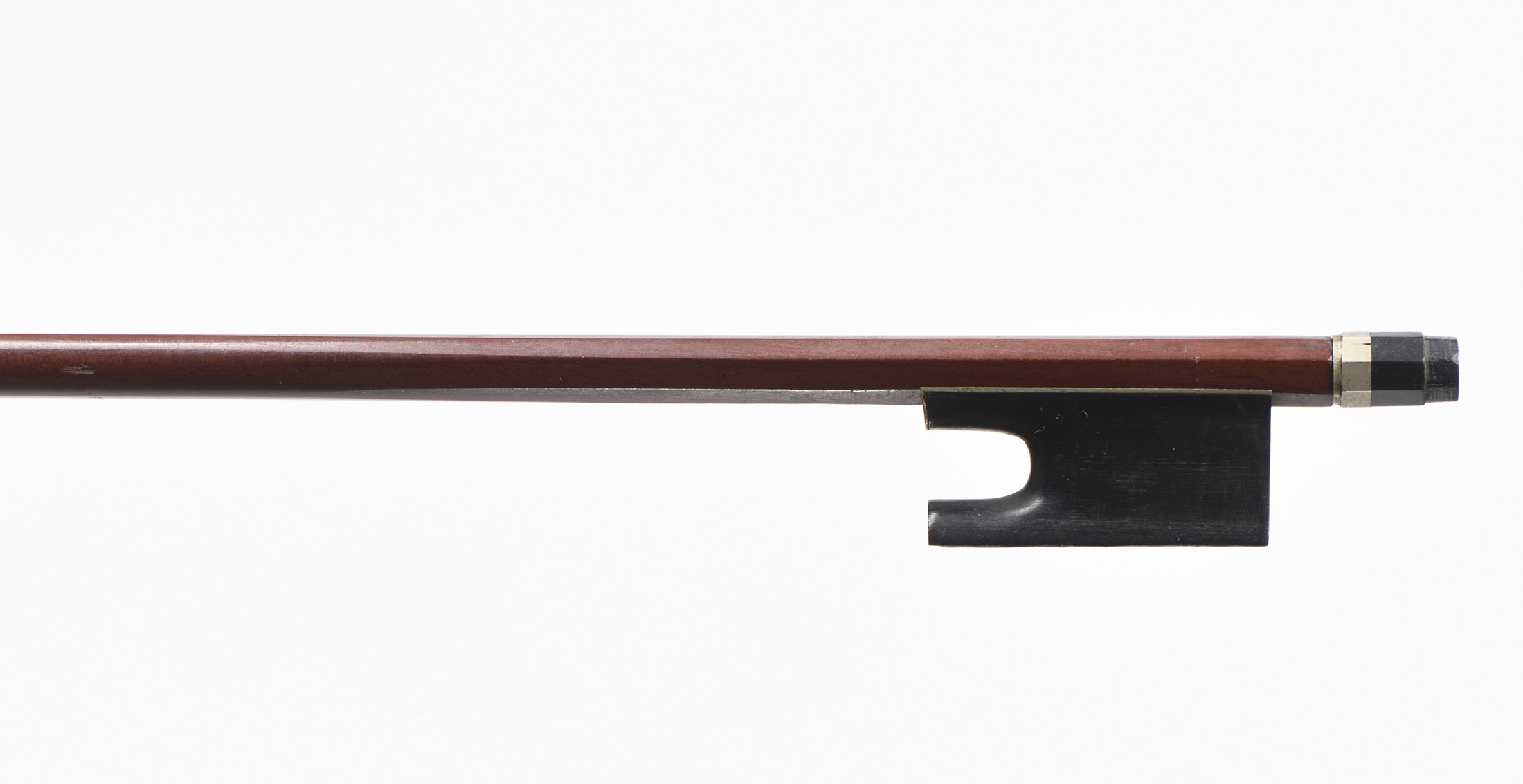 baguette ronde en bois exotique. Hausse ouverte en ébène montée maillechort. Manque une virole au bouton. 729 mm. 61 g sans mèche, ni garniture.