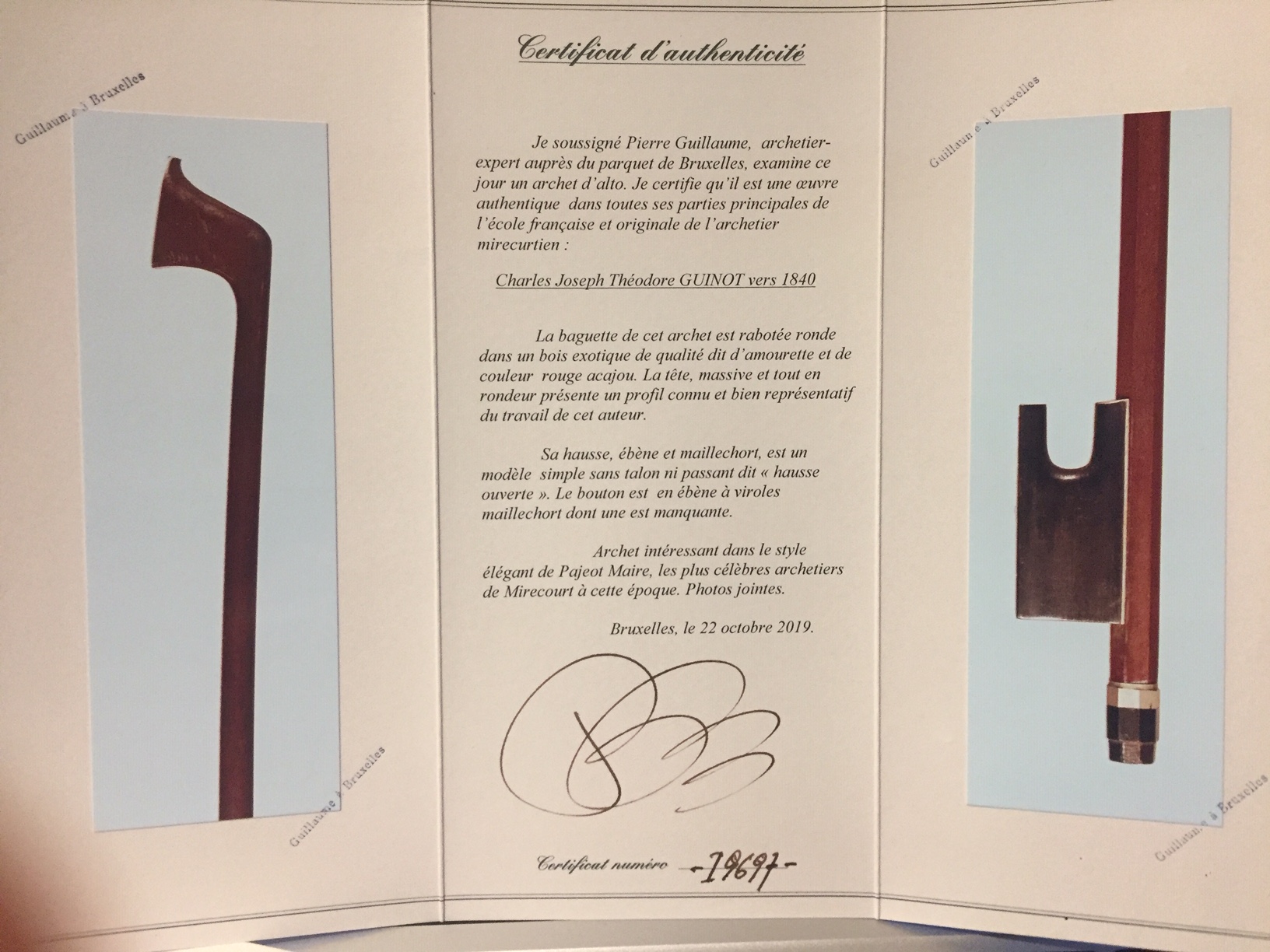 Viola bow by Charles Joseph Théodore GUINOT. Pierre GUILLAUME certificate.
