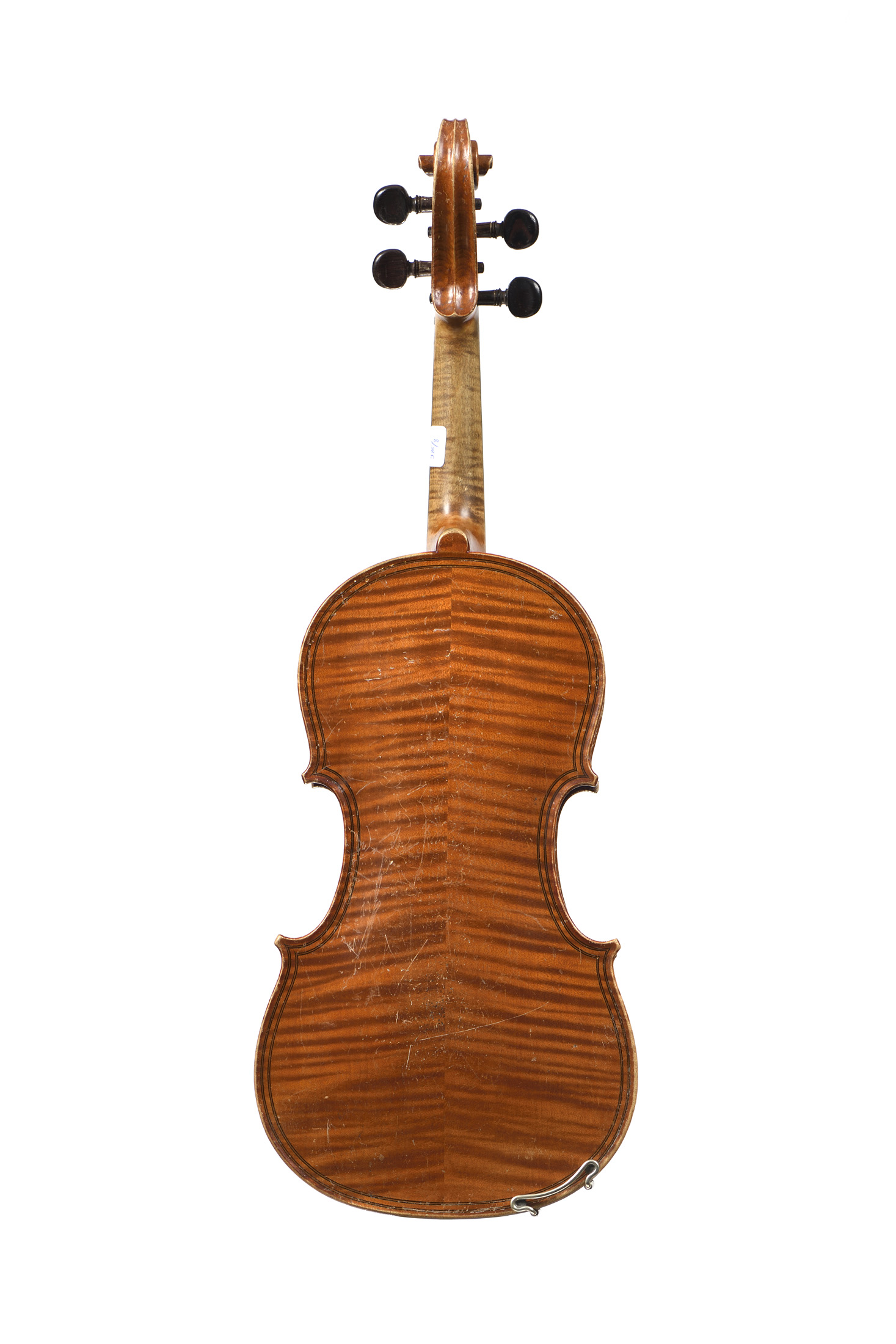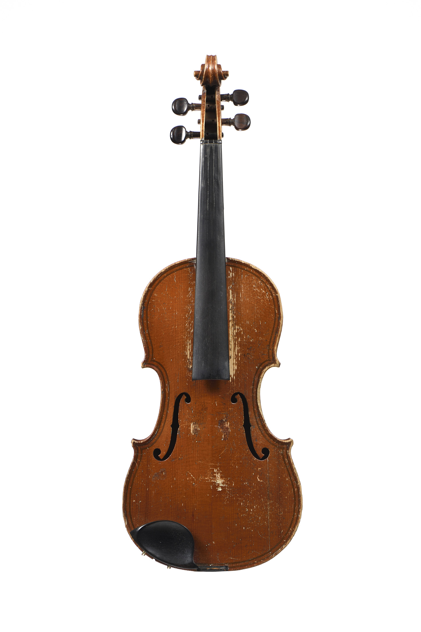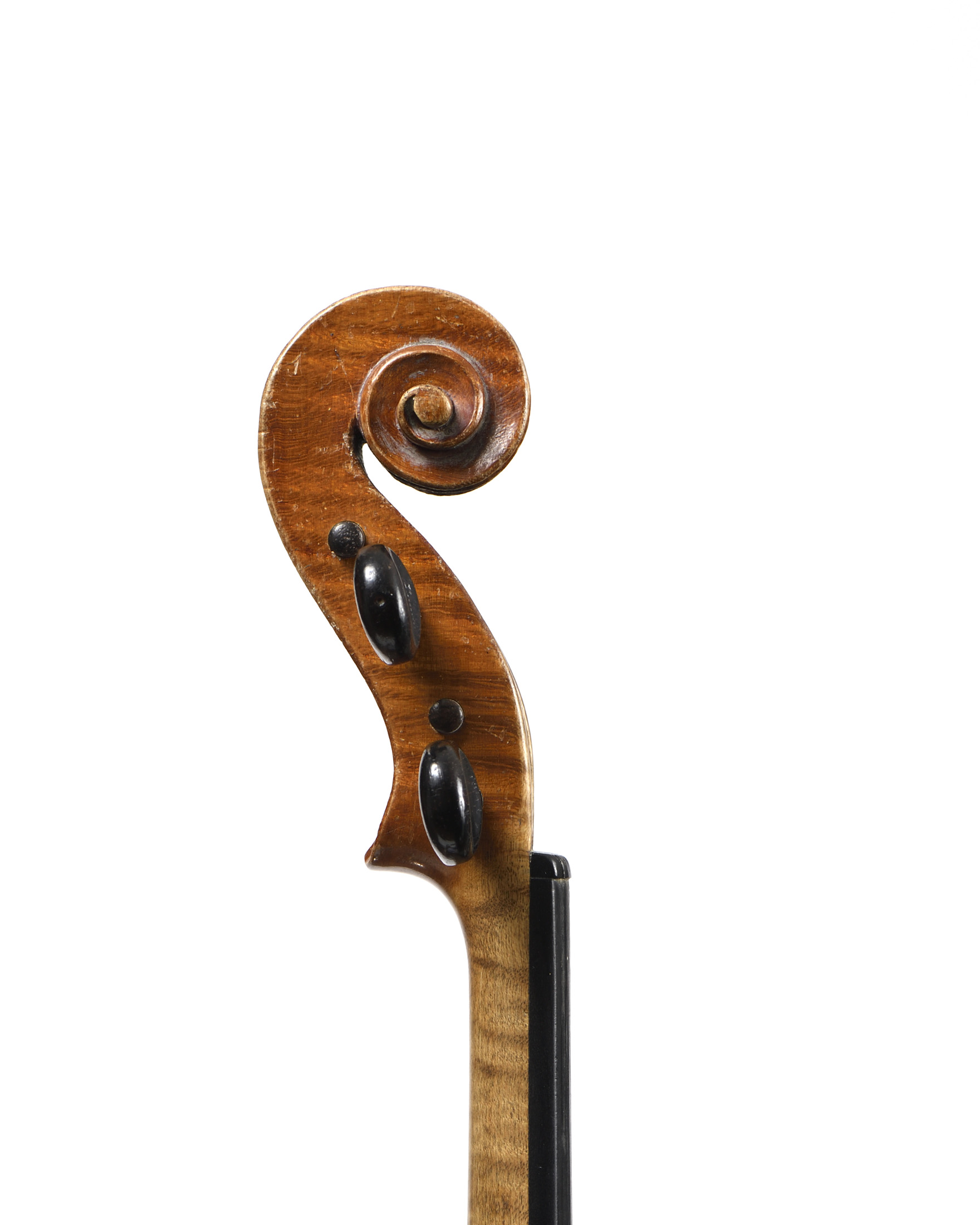 fait sur un modèle Maggini double filets. Fond de deux pièces en érable. Vernis brun sur fond doré. Une cassure au flan restaurée, usures de vernis. 354 mm.