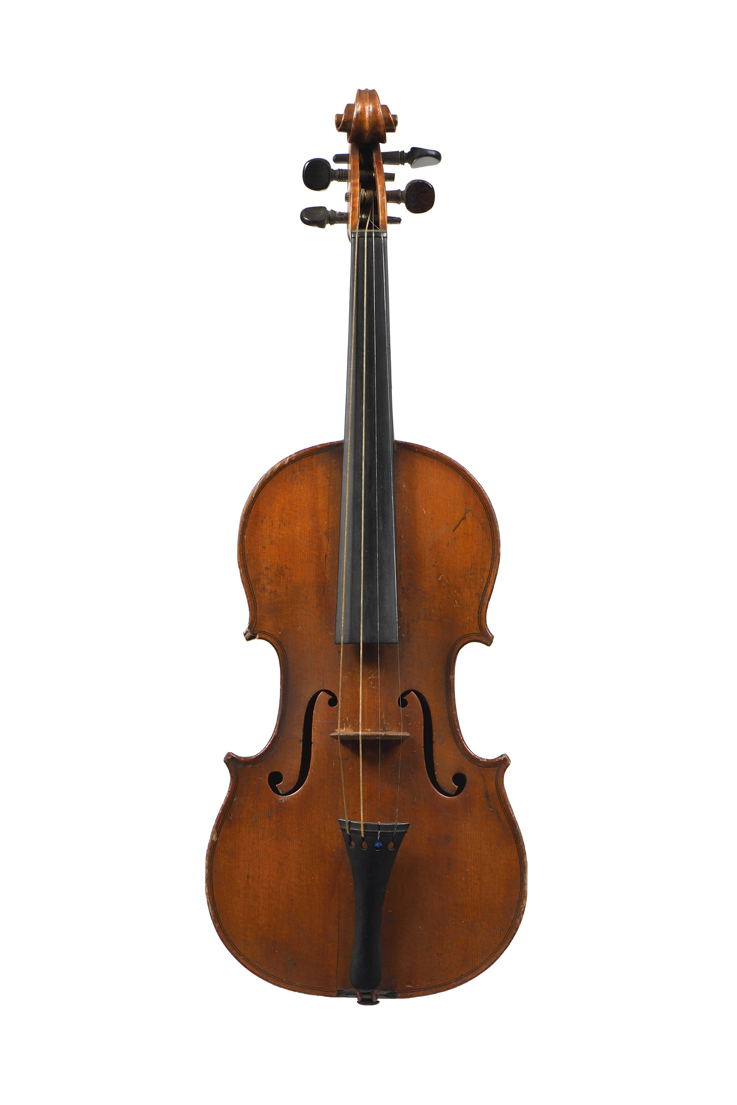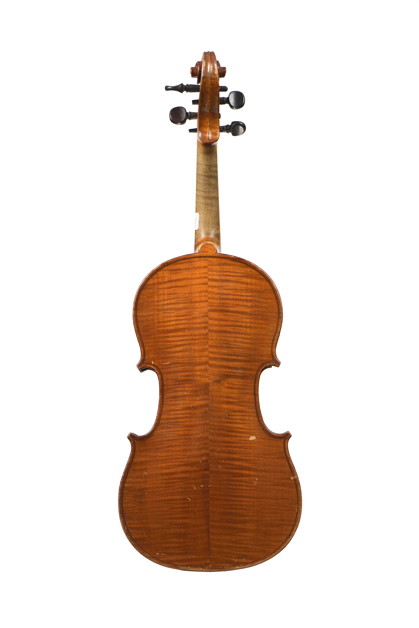 portant une étiquette "Antonius Stradivarius...1712." et une étiquette "P.BEUSCHER...PARIS". Fond de deux pièces en érable. Diverses cassures à la table: L'ensemble est à restaurer. Avec boite et archet