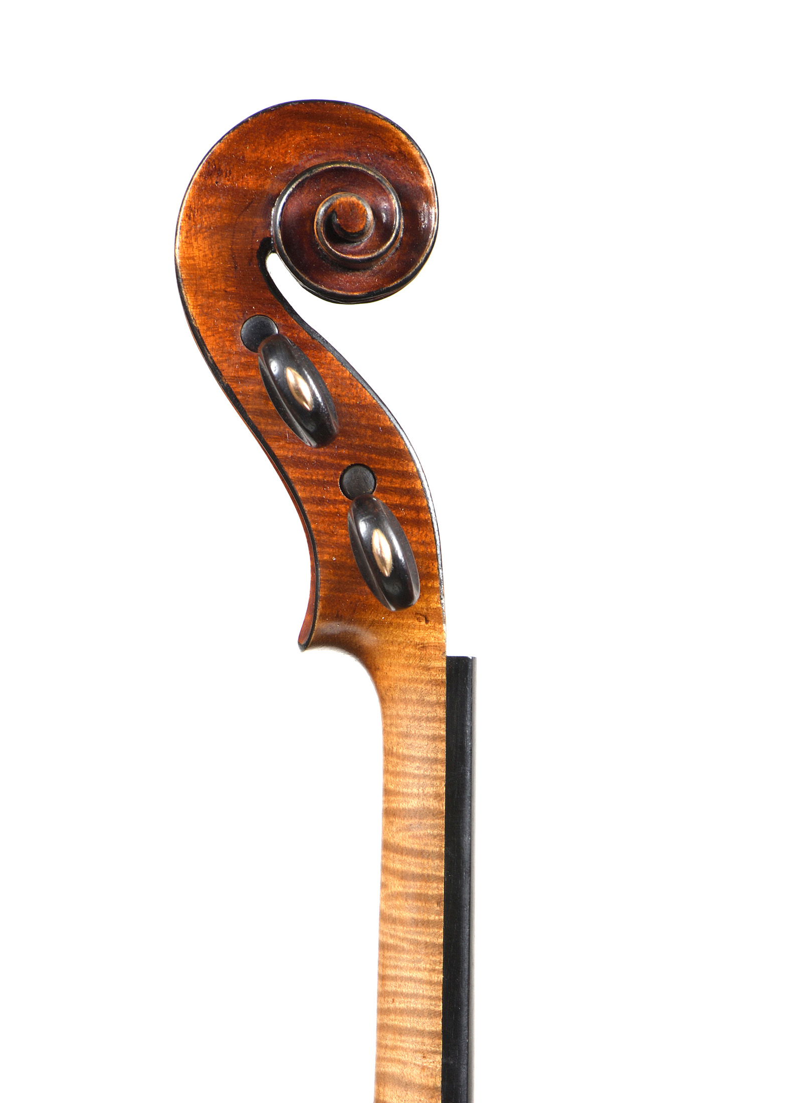 portant une étiquette apocryphe "Charles Brugere, 11 Faubourg poissonnière. N° 326 PARIS A.N 1930." et les marques au fer C.BRUGERE. Fond de deux pièces en érable. Vernis brun rouge sur fond doré. Usures et petites cassures. Retouches de vernis. 358 mm.