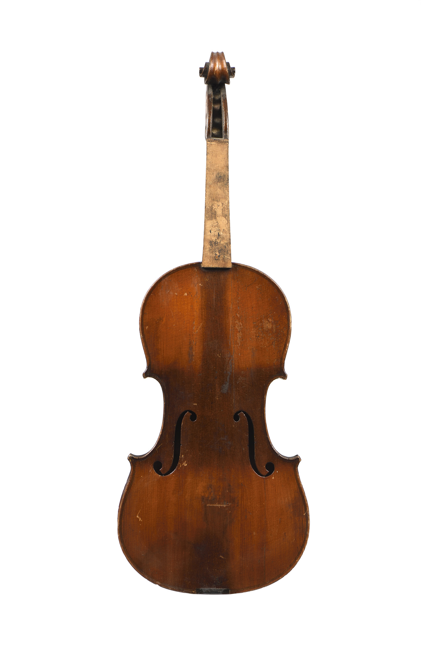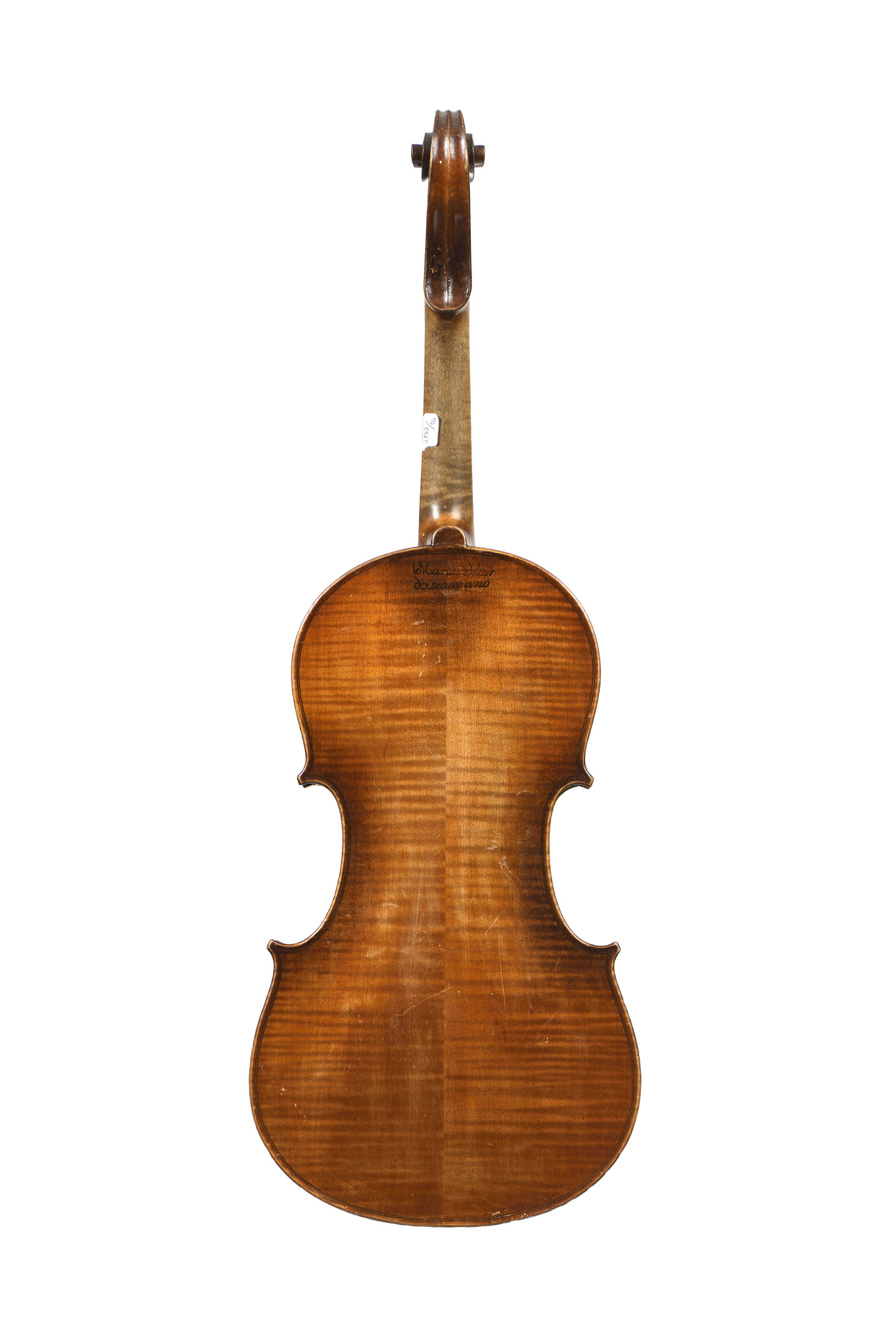 portant la marque "Marquis de l'air d'oiseaux" sous le talon du manche. Fond de deux pièces. Vernis brun sur fond doré. Cassure d'âme au fond. Manque la touche... 357 mm.