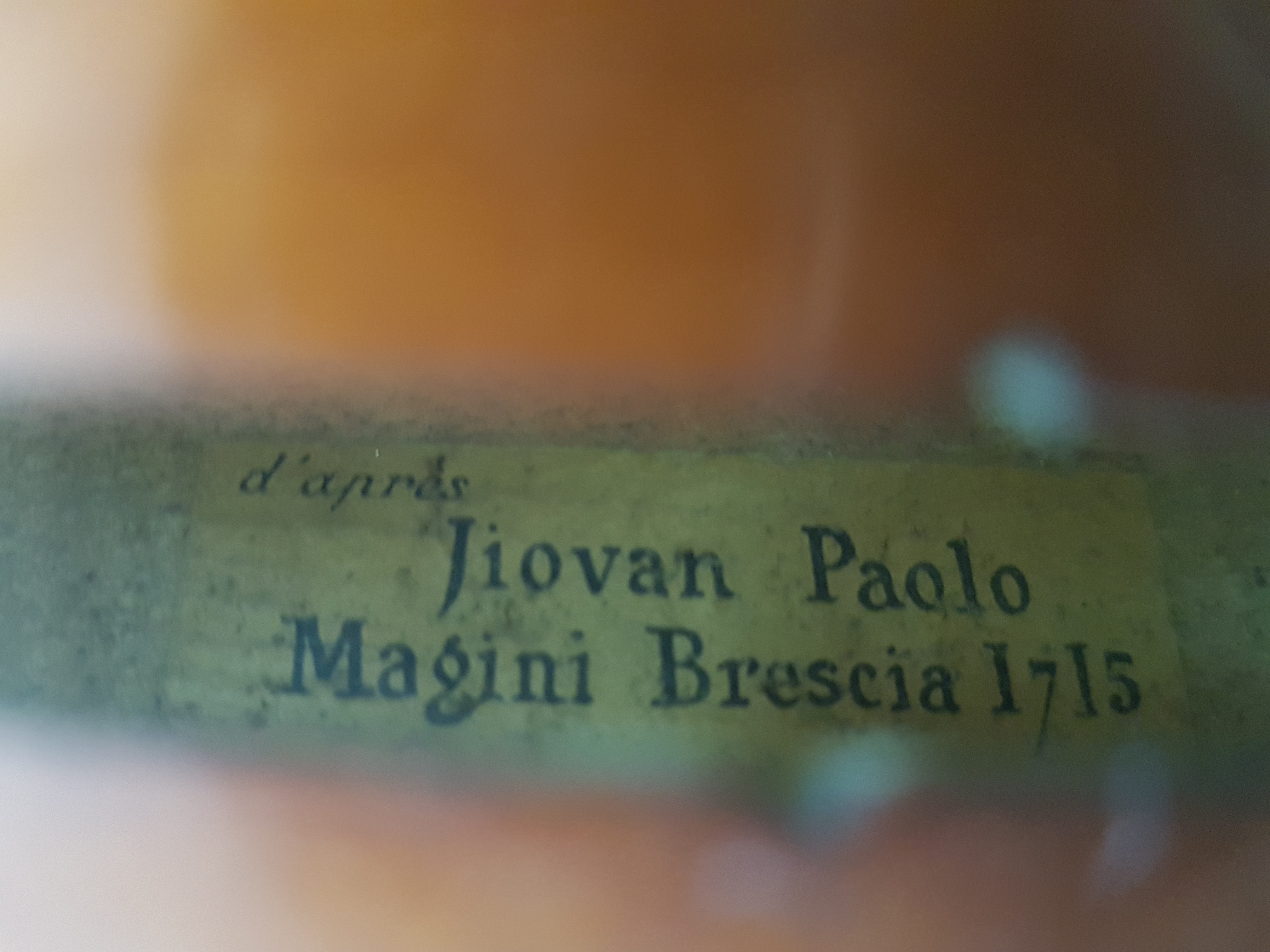 modèle Maggini. Portant une étiquette "Jiovan Paolo Magini Brescia 1715". Fond de deux pièces en érable. Avec boite. Double filets. 366 mm. Bon état général.