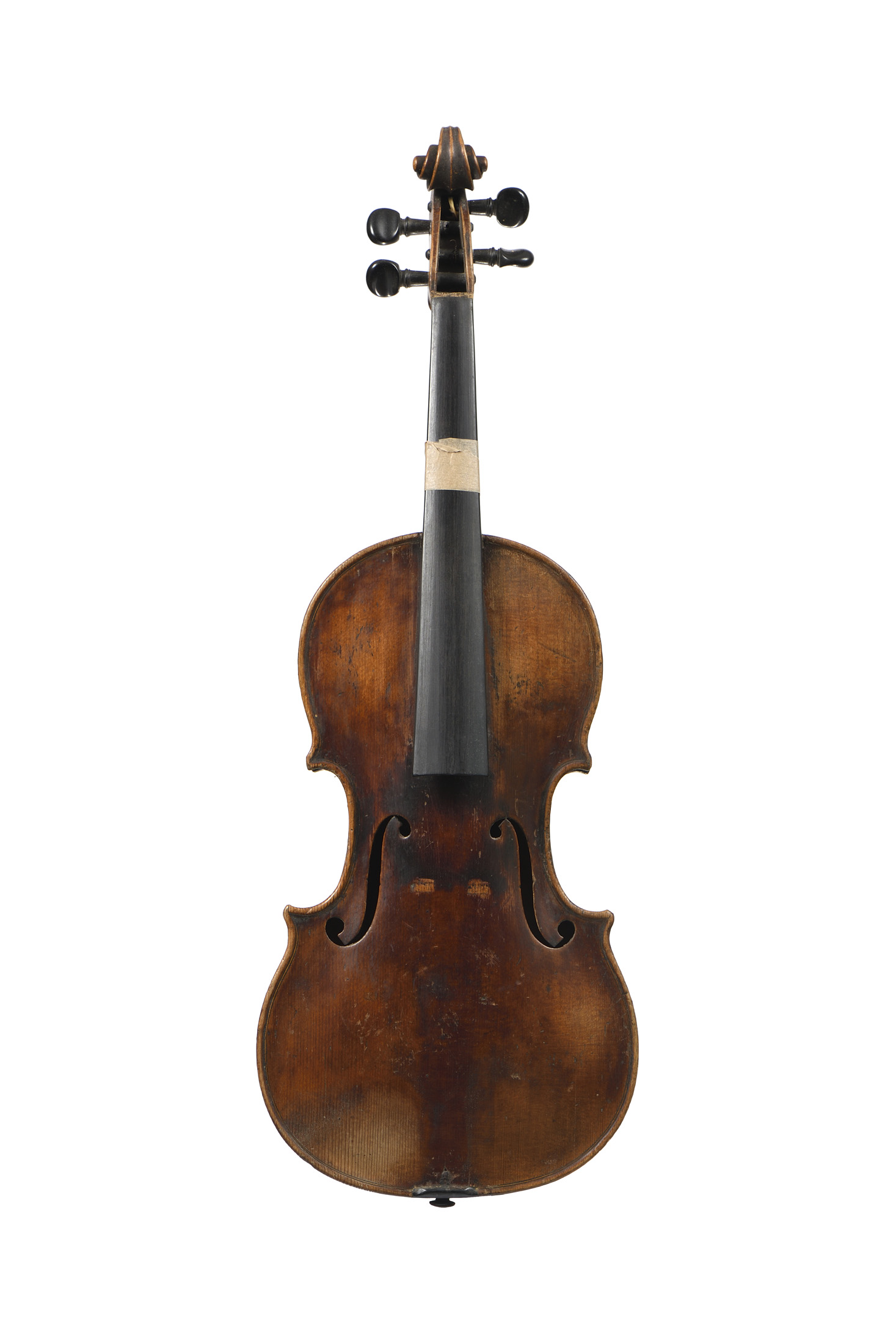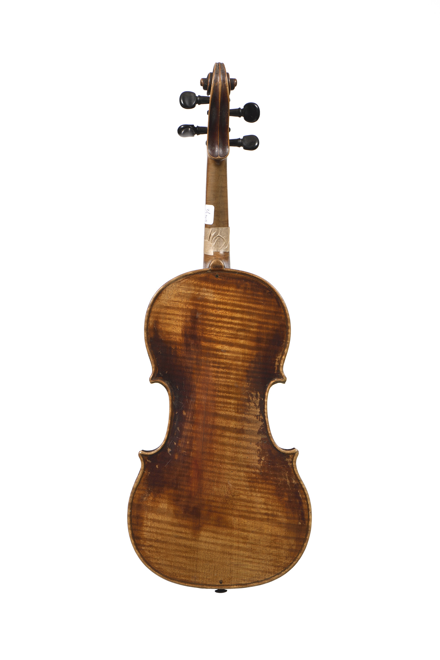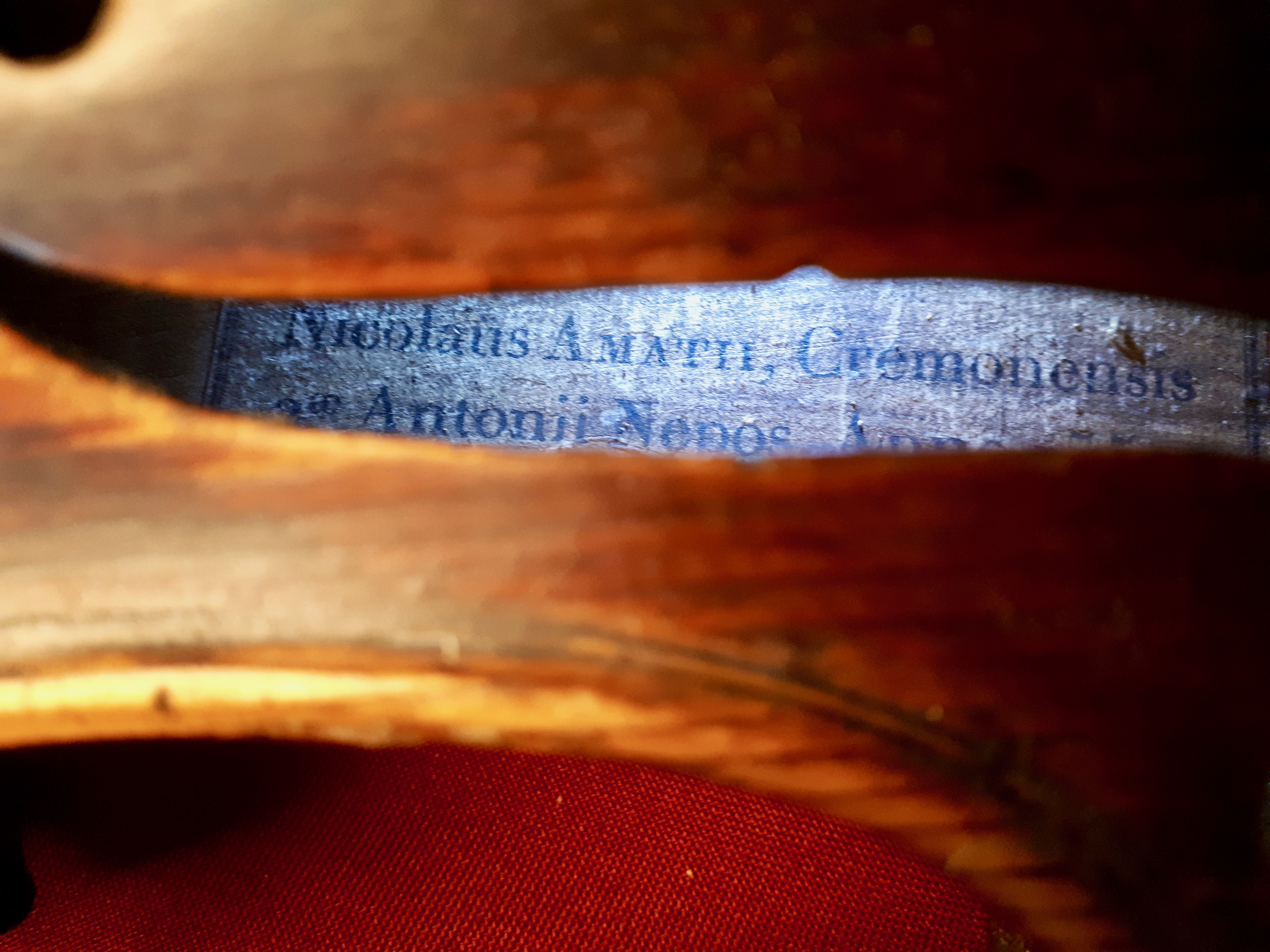 portant une étiquette "Nicolaus Amatus 1559..." et une étiquette de réparation. Fond d'une pièce en érable, avec fracture d'âme au fond. Avec une hausse ancienne abimée. Etui de table. 360 mm.